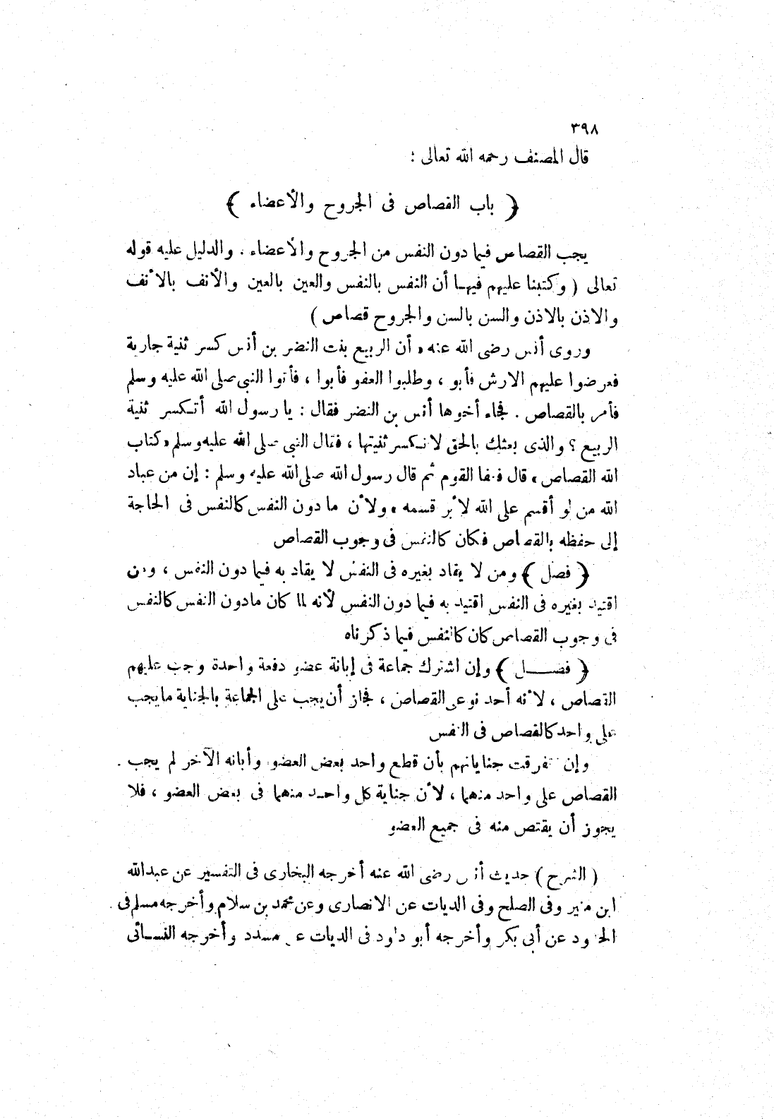يحرز أن يقتص منه في جميع العضو (الشرح) حديث أنس رضى الله عنه أخرجه البخاري في التفسير عن عبد الله ابن منير وفي الصلح وفي الديات عن الانصاري وعن محمد بن سلام أخرجه مسلم في الحنود عن أبى بكر واخرجه أبو داود في الديات عن مسدد وأخرجه النسائي
