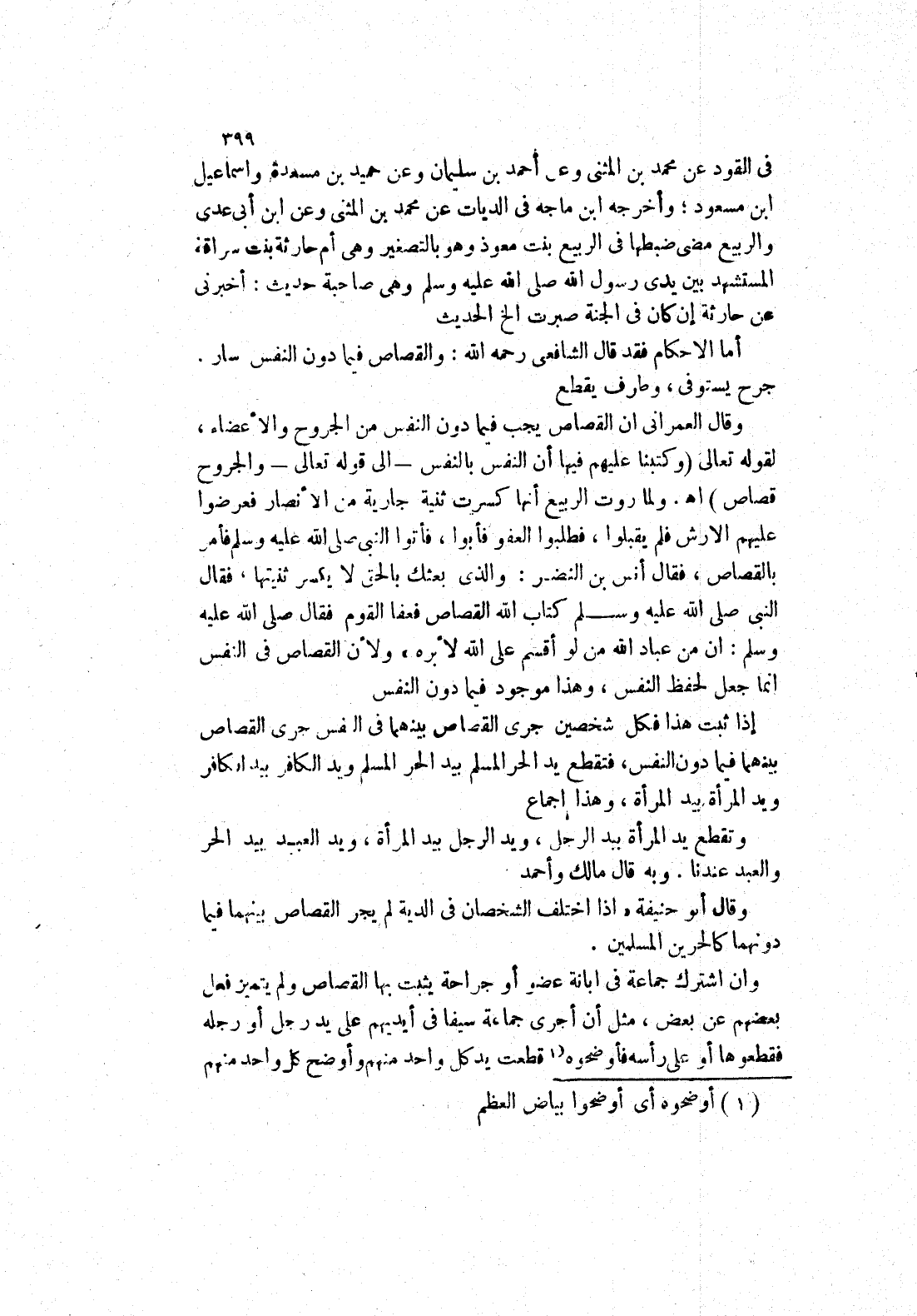 في القود عن محمد بن المثنى وعن أحمد بن سليمان وعن حميد بن مسعدة واسماعيل ابن مسعود: وأخرجه ابن ماجه في الديات عن محمد بن المثنى وعن ابن أبى عدى والربيع مضى ضبطها في الربيع بنت معوذ وهو بالتصغير وهى أم حارية بنت سراقة المستشهد بين يدى رَسُولِ اللَّهِ صَلَّى اللَّهُ عَلَيْهِ وَسَلَّمَ وَهِيَ صاحبة حديث: أخبرني عن حارثة إن كان في الجنة صبرت الخ الحديث أما الاحكام فقد قال الشافعي رحمه الله: والقصاص فيما دون النفس سار.