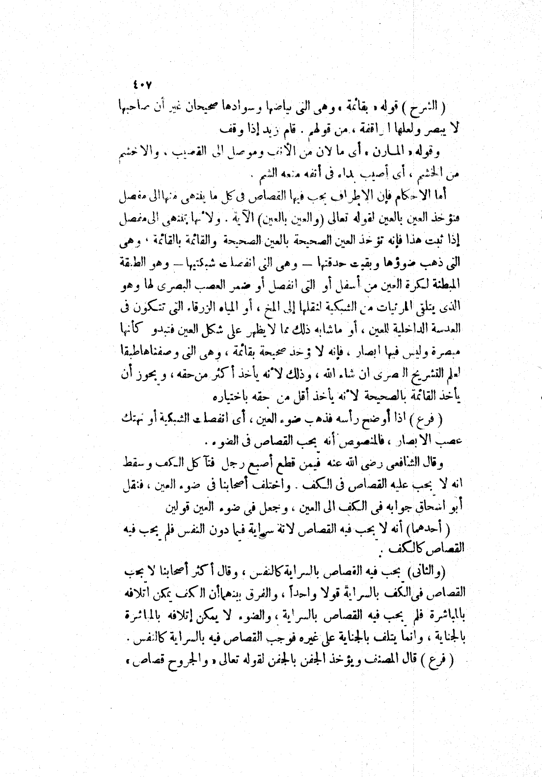ولانها تنتهى إلى مفصل إذا ثبت هذا فإنه تؤخذ العين الصحيحة بالعين الصحيحة والقائمة بالقائمة، وهى التي ذهب ضوؤها وبقيت حدقتها - وهي التي انفصلت شبكتيها - وهو الطبقة المبطنة لكرة العين من أسفل أو التي انفصل أو ضمر العصب البصري لها وهو الذي يتلقى المرئيات من الشبكية لنقلها إلى المخ، أو المياه الزرقاء التي تتكون في العدسة الداخلية للعين، أو ما شابه ذلك مما لا يظهر على شكل العين فتبدو كأنها مبصرة وليس فيها ابصار، فإنه لا تؤخذ صحيحة بقائمة، وهي التي وصفناها طبقا لعلم التشريح البصري ان شاء الله، وذلك لانه يأخذ أكثر من حقه، ويجوز أن يأخذ القائمة بالصحيحة لانه يأخذ أقل من حقه باختياره (فرع)