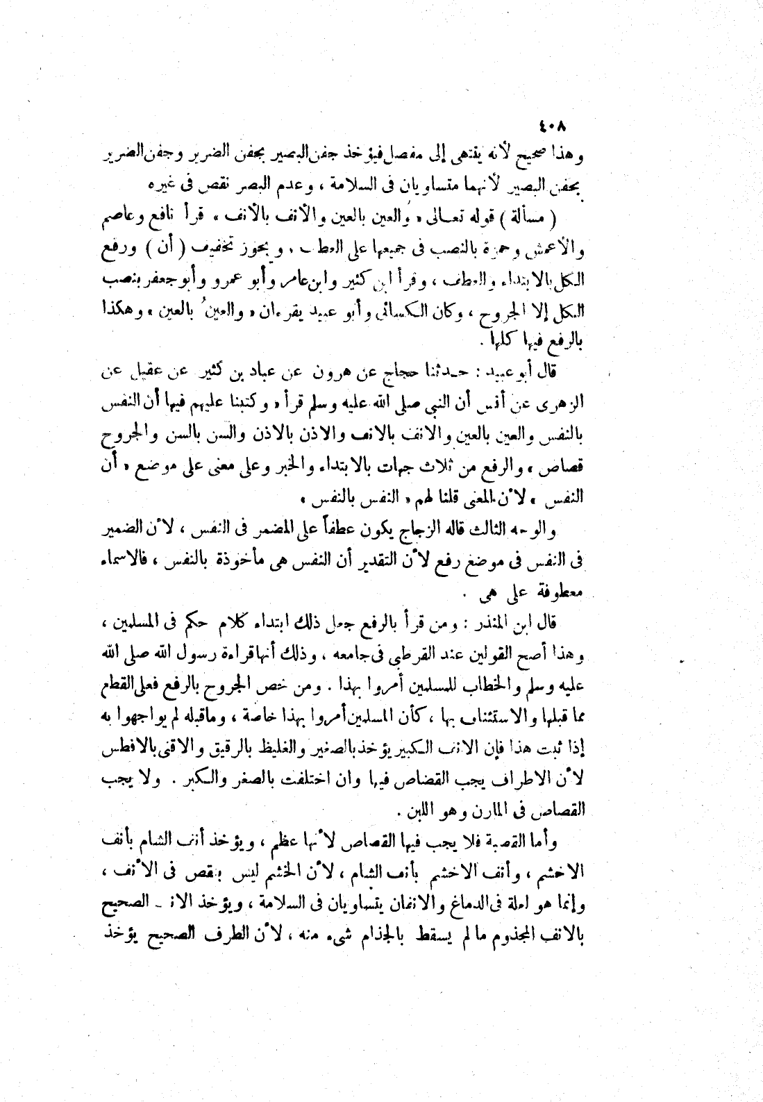 ومن خص الجروح بالرفع فعلى القطع مما قبلها والاستناف بها، كأن المسلمين أمروا بهذا خاصة، وما قبله لم يواجهوا به إذا ثبت هذا فإن الانف الكبير يؤخذ بالصغير والغليظ بالرقيق والاقنى بالافطس لان الاطراف يجب القصاص فيها وان اختلفت بالصغر والكبر.