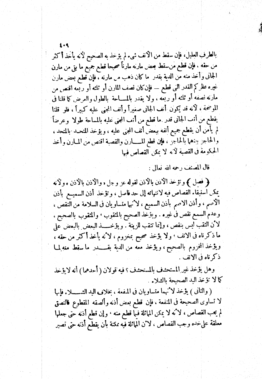 بالطرف العليل، فإن سقط من الانف شئ لم يؤخذ به الصحيح لانه يأخذ أكثر من حقه، فإن قطع من سقط بعض مارنه مارنا صحيحا قطع جميع ما بقى من مارن الجاني وأخذ منه من الدية بقدر ماكان ذهب من مارنه، فإن قطع بعض مارن غيره نظركم القدر التي قطع - فإن كان نصف المارن أو ثلثه أو ربعه أقتص من مارنه نصفه أو ثلثه أو ربعه، ولا يقدر بالمساحة بالطول والعرض كما قلنا في الموضحة، لانه قد يكون أنف الجاني صغيرا وأنف المجني عليه كبيرا، فلو قلنا يقطع من أنف الجاني قدر ما قطع من أنف المجني عليه بالمساحة طولا وعرضا لم يأمن أن يقطع جميع أنفه ببعض أنف المجني عليه، ويؤخذ المتحد بالمتحد، والحاجز بينهما بالحاجز، فإى قطع المارن والقصبة اقتص من المارن وأخذ الحكومة في القصبة لانه لا يمكن القصاص فيها