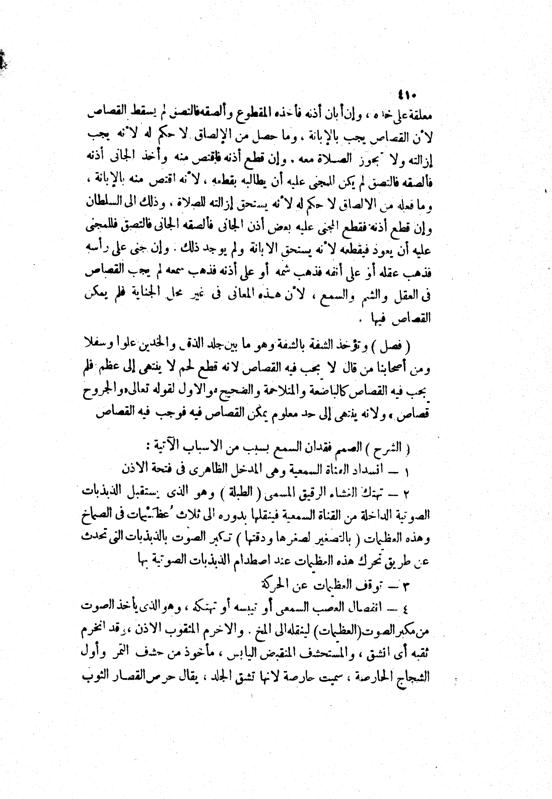 يجب فيه القصاص كالباضعة والمتلاحمة والضجيج والاول لقوله تعالى " والجروح قصاص " ولانه ينتهى إلى حد معلوم يمكن القصاص فيه فوجب فيه القصاص (الشرح) الصمم فقدان السمع بسبب من الاسباب الآتية، 1 - انسداد القناة السمعية وهى المدخل الظاهرى في فتحة الاذن 2 - تهتك الغشاء الرقيق المسمى (الطلبة) وهو الذي يستقبل الذبذبات الصوتية الداخلة من القناة السمعية فينقلها بدوره إلى ثلاثة عظيمات في الصماخ وهذه العظيمات (بالتصغير لصغرها ودقتها) تكبر الصوت بالذبذبات التي تحدث عن طريق تحرك هذه العظيمات عند اصطدام الذبذبات الصوتية بها 3 - توقف العظيمات عن الحركة 4 - انفصال العصب السمعى أو تيبسه أو تهتكه، وهو الذي يأخذ الصوت من مكبر الصوت (العظيمات) لينلقه إلى المخ.