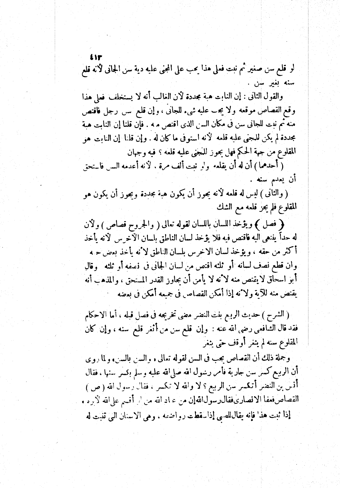 ويؤخذ اللسان باللسان لقوله تعالى (والجروح قصاص) ولان له حدا ينتهى إليه فاقتص فيه فلا يؤخذ لسان الناطق بلسان الاخرس لانه يأخذ أكثر من حقه، ويؤخذ لسان الاخرس بلسان الناطق لانه يأخذ بعض حقه وان قطع نصف لسانه أو ثلثه أقتص من لسان الجاني في نصفه أو ثلثه وقال أبو إسحاق لايقتص منه لانه لا يأمن أن يجاوز القدر المستحق، والمذهب أنه يقتص منه للآية ولانه إذا أمكن القصاص في جميعه أمكن في بعضه (الشرح) حديث الربع بنت النضر مضى تخريجه في فصل قبله، أما الاحكام فقد قال الشافعي رضى الله عنه: وإن قلع سن من أثغر قلع سنه، وإن كان المقلوع سن لم يثغر أوقف حتى يثغر وجملة ذلك أن القصاص يجب في السن لقوله تعالى " والسن بالسن " ولما روى أن الربيع كسر سن جارية فَأَمَرَ رَسُولُ اللَّهِ صَلَّى اللَّهُ عَلَيْهِ وَسَلَّمَ بكسر سنها، فقال
