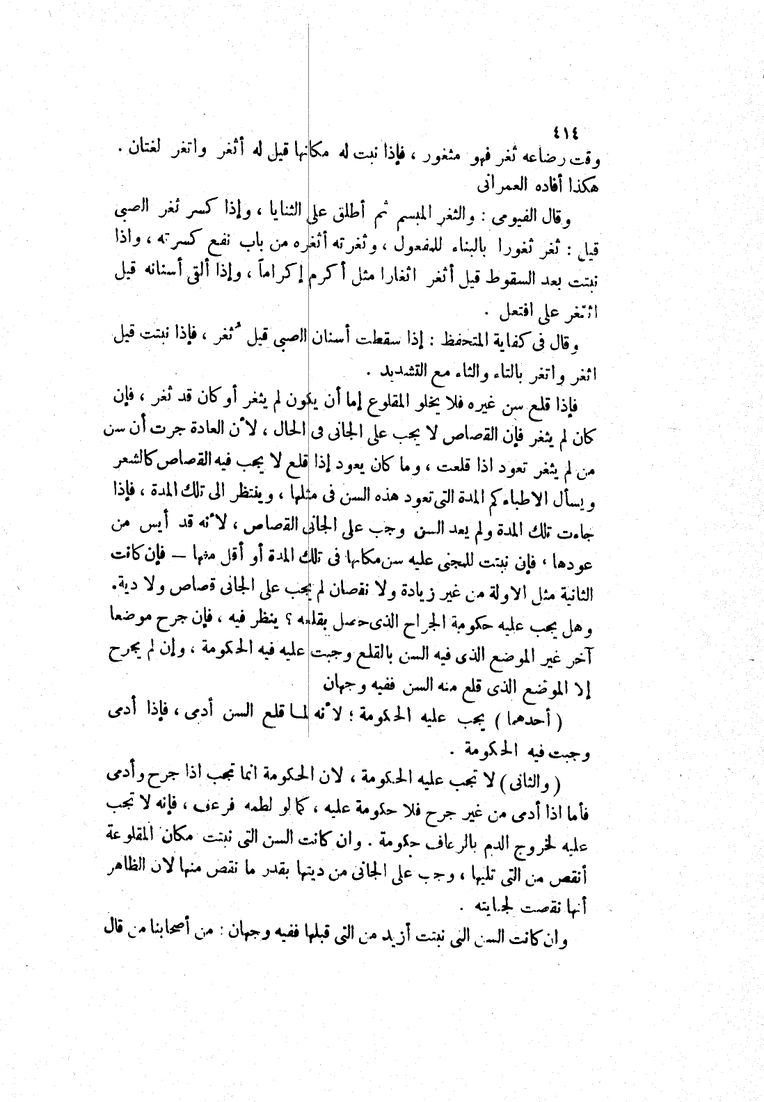 وان كانت السن التي نبتت مكانه المقلوعة أنقص من التي تليها، وجب على الجاني من ديتها بقدر ما نقص منها لان الظاهر أنها نقصت لجنايته.