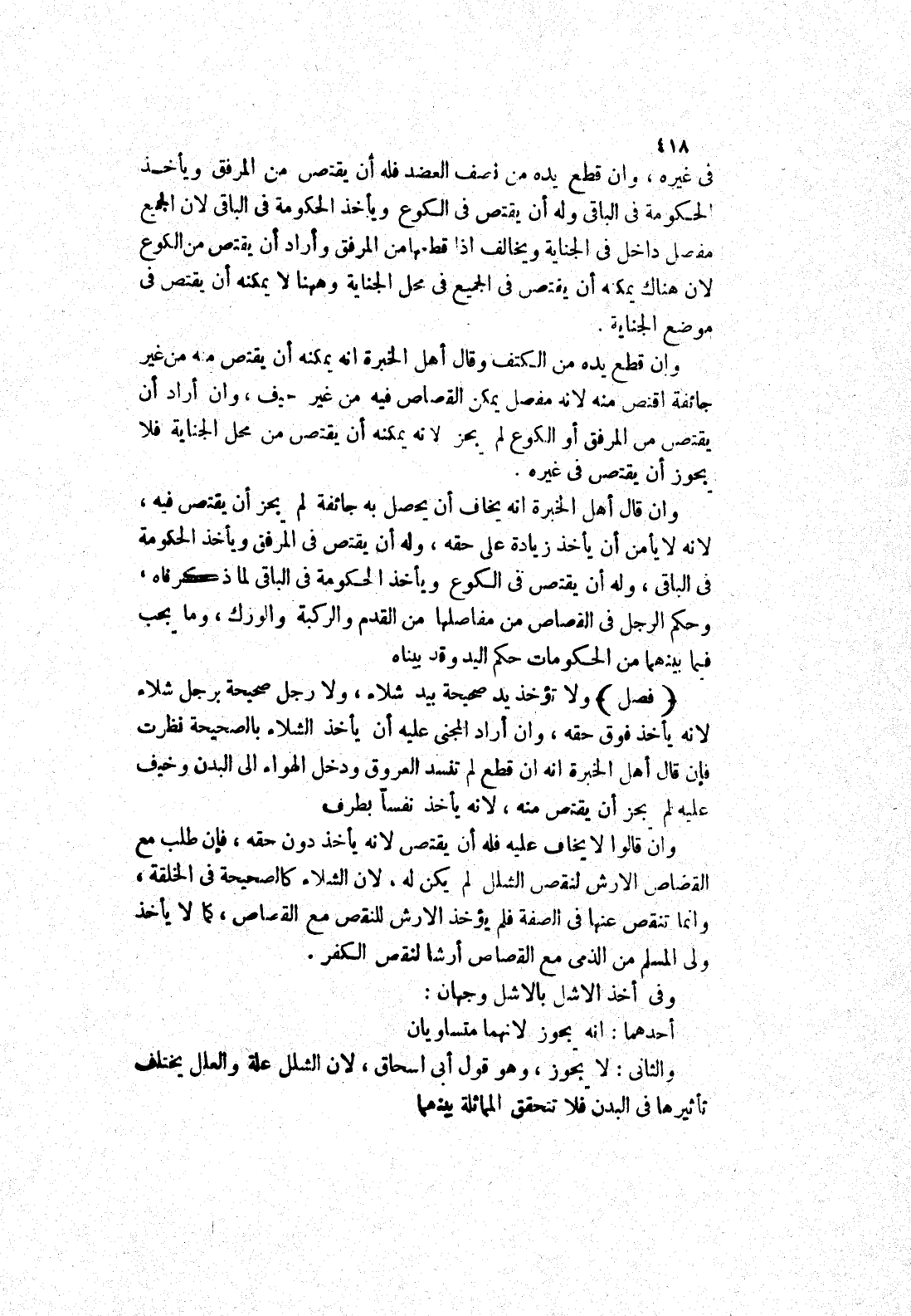 ولا تؤخذ يد صحيحه بيد شلاء، ولا رجل صحيحه برجل شلاء لانه يأخذ فوق حقه، وان أراد المجني عليه أن ياخذ الشلاء بالصحيحة نظرت فإن قال أهل الخبرة أنه ان قطع لم تنسد العروق ودخل الهواء إلى البدن وخيف عليه لم يجز أن يقتص منه، لانه يأخذ نفسا بطرف وان قالوا لا يخاف عليه فله أن يقتص لانه يأخذ دون حقه، فإن طلب مع القصاص الارض لنقص الشلل لم يكن له، لان الشلاء كالصحيحة في الخلقة، وانما تنقص عنها في الصفة فلم يؤخذ الارش للنقص مع القصاص، كما لا يأخذ ولى المسلم من الذمي مع القصاص ارشا لنقص الكفر.