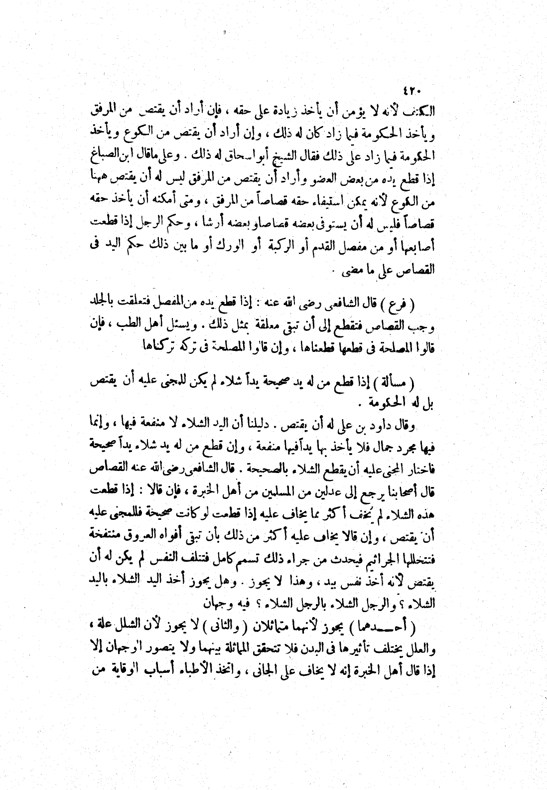 قال الشافعي رضى الله عنه القصاص قال أصحابنا يرجع إلى عدلين من المسلمين من أهل الخبرة، فإن قالا: إذا قطعت هذه الشلاء لم يخف أكثر مما يخاف عليه إذا قطعت لو كانت صحيحة فللمجنى عليه أن يقتص، وإن قالا يخاف عليه أكثر من ذلك بأن تبقى أفواه العروق منتفخة فتتخللها الجراثيم فيحدث من جراء ذلك تسمم كامل فتتلف النفس لم يكن له أن يقتص لانه أخذ نفس بيد، وهذا لا يجوز، وهل يجوز أخذ اليد الشلاء باليد الشلاء؟ والرجل الشلاء بالرجل الشلاء؟ فيه وجهان