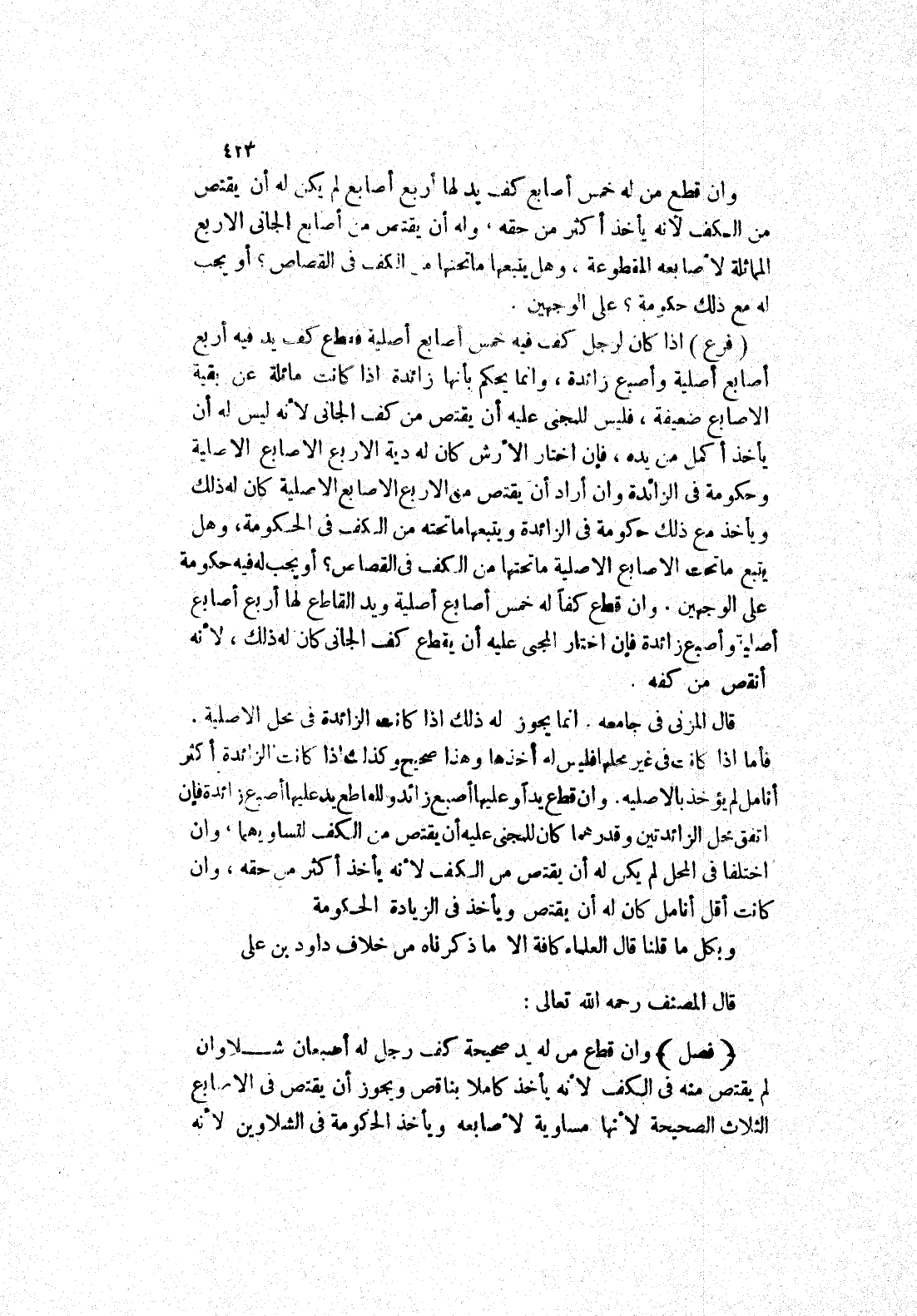 إذا كان لرجل كف فيه خمس أصابع أصلية فقطع كف يد فيه أربع أصابع أصلية وأصبع زائدة، وانما يحكم بأنها زائدة إذا كانت مائلة عن بقية الاصابع ضعيفة، فليس للمجني عليه أن يقتص من كف الجاني لانه ليس له أن يأخذ أكمل من يده، فإن اختار الارش كان له دية الاربع الاصابع الاصلية وحكومة في الزائدة وان أراد أن يقتص من الاربع الاصابع الاصلية كان له ذلك ويأخذ مع ذلك حكومة في الزائدة يتبعها ما تحته من الكف في الحكومة، وهل يتبع ما تحت الاصابع الاصلية ما تحتها من الكف في القصاص؟ أو يجب له فيه حكومة على الوجهين.