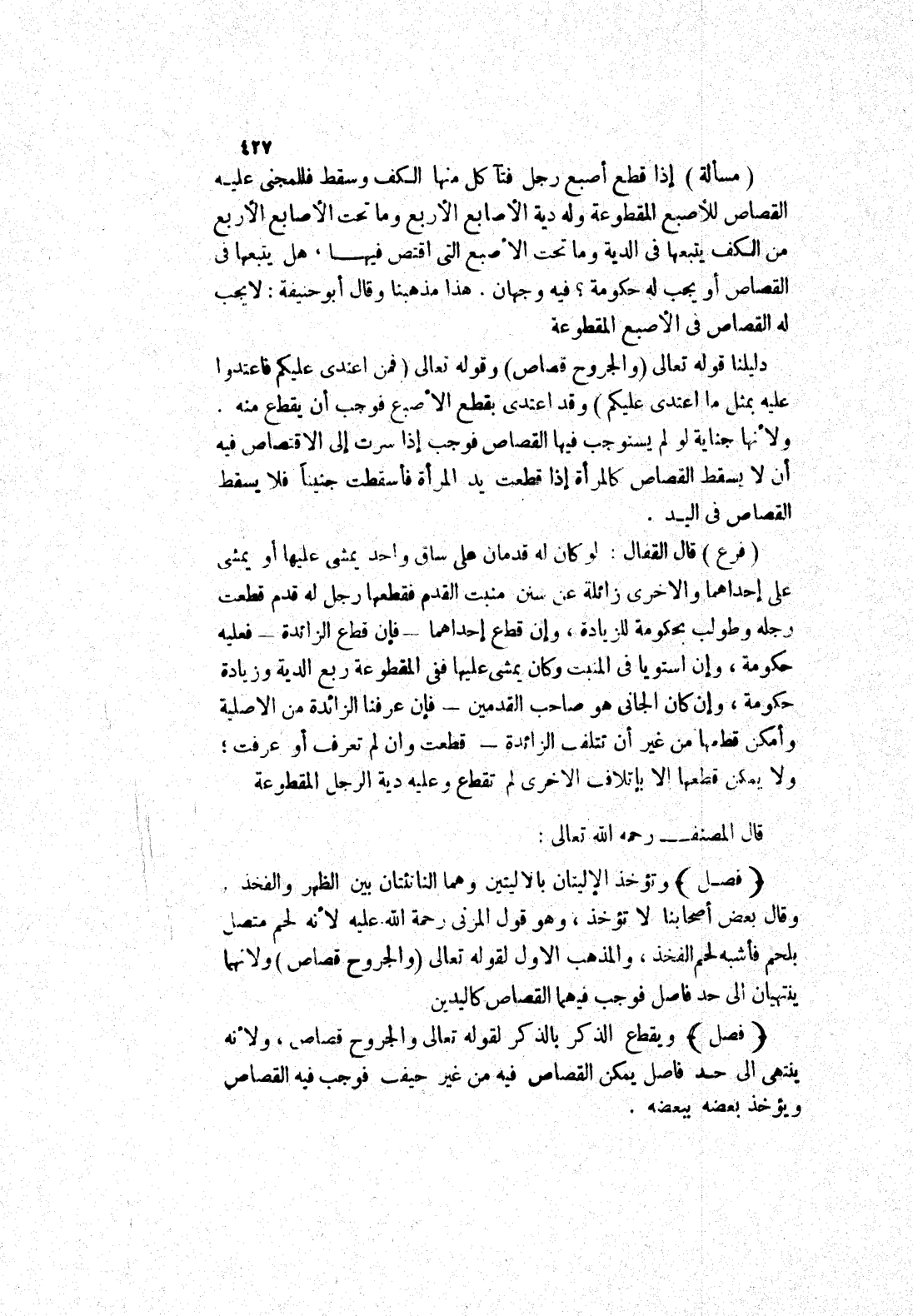 (مسألة) إذا قطع أصبع رجل فتأكل منها الكف وسقط فللمجنى عليه القصاص للاصبع المقطوعة وله دية الاصابع الاربع وما تحت الاصابع الاربع من الكف يتبعها في الدية وما تحت الاصبع التي اقتص فيها، هل يتبعها في القصاص أو يجب له حكومة؟ فيه وجهان.