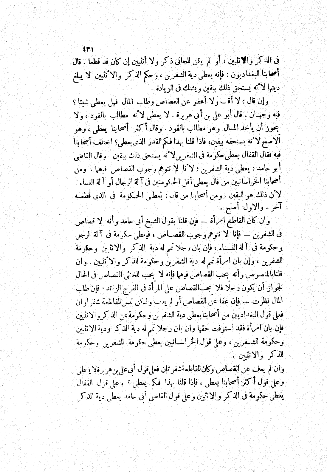 وان قلنا بالمنصوص وأنه يجب القصاص فيهما فإنه لا يجب للخنثى القصاص في الحال لجواز ان يكون رجلا فلا يجب القصاص على المراة في الفرج الزائد، فإن طلب المال نظرت - فإن عفا عن القصاص أو لم يعف ولكن ليس للقاطعة شفراوان فعلى قول البغداديين من أصحابنا يعطى دية الشفرين وحكومة عن الذكر والانثيين فإن بان امرأة فقد استوفت حقها وان بان امرأة فقد استوفت حقها وان بان رجلا تمم له دية الذكر ودية الانثيين وحكومة الشفرين، وعلى قول الخراسانيين يعطى حكومة للشفرين وحكومة للذكر والانثيين.