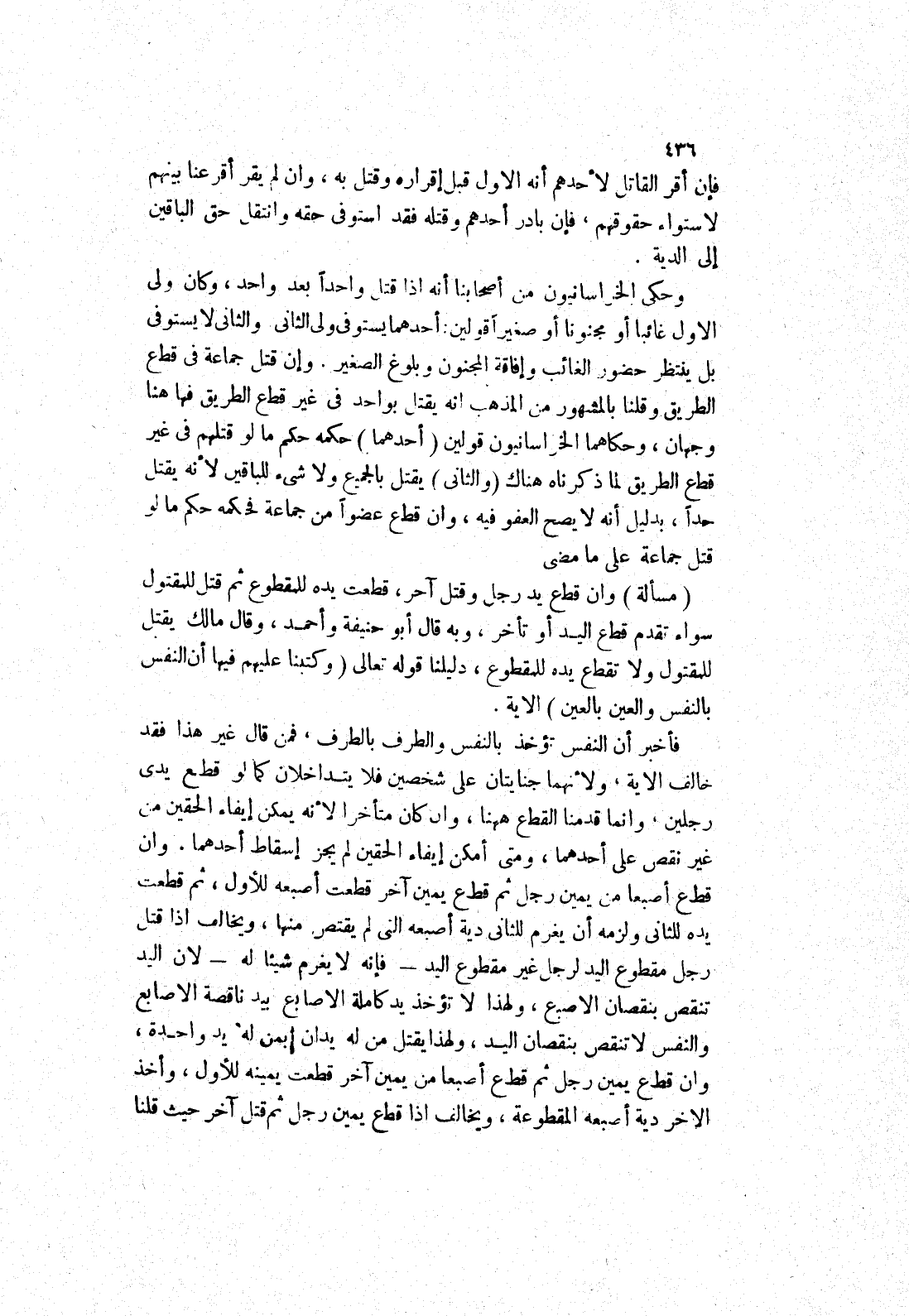 وان قطع أصبعا من يمين رجل ثم قطع يمين آخر قطعت أصبعه للاول، ثم قطعت يده للثاني ولزمه أن يغرم للثاني دية أصبعه التي لم يقتص منها، ويخالف إذا قتل رجل مقطوع اليد لرجل غير مقطوع اليد - فإنه لا يغرم شيئا له - لان اليد تنقص بنقصان الاصبع، ولهذا لا تؤخذ يد كاملة الاصابع بيد ناقصة الاصابع والنفس لا تنقص بنقصان اليد، ولهذا يقتل من له يدان بمن له يدان بمن له يد واحدة، وان قطع يمين رجل ثم قطع أصبعا من يمين آخر قطعت يمينه للاول، وأخذ الاخر دية أصبعه المقطوعة، ويخالف إذا قطع يمين رجل ثم قتل آخر حيث قلنا