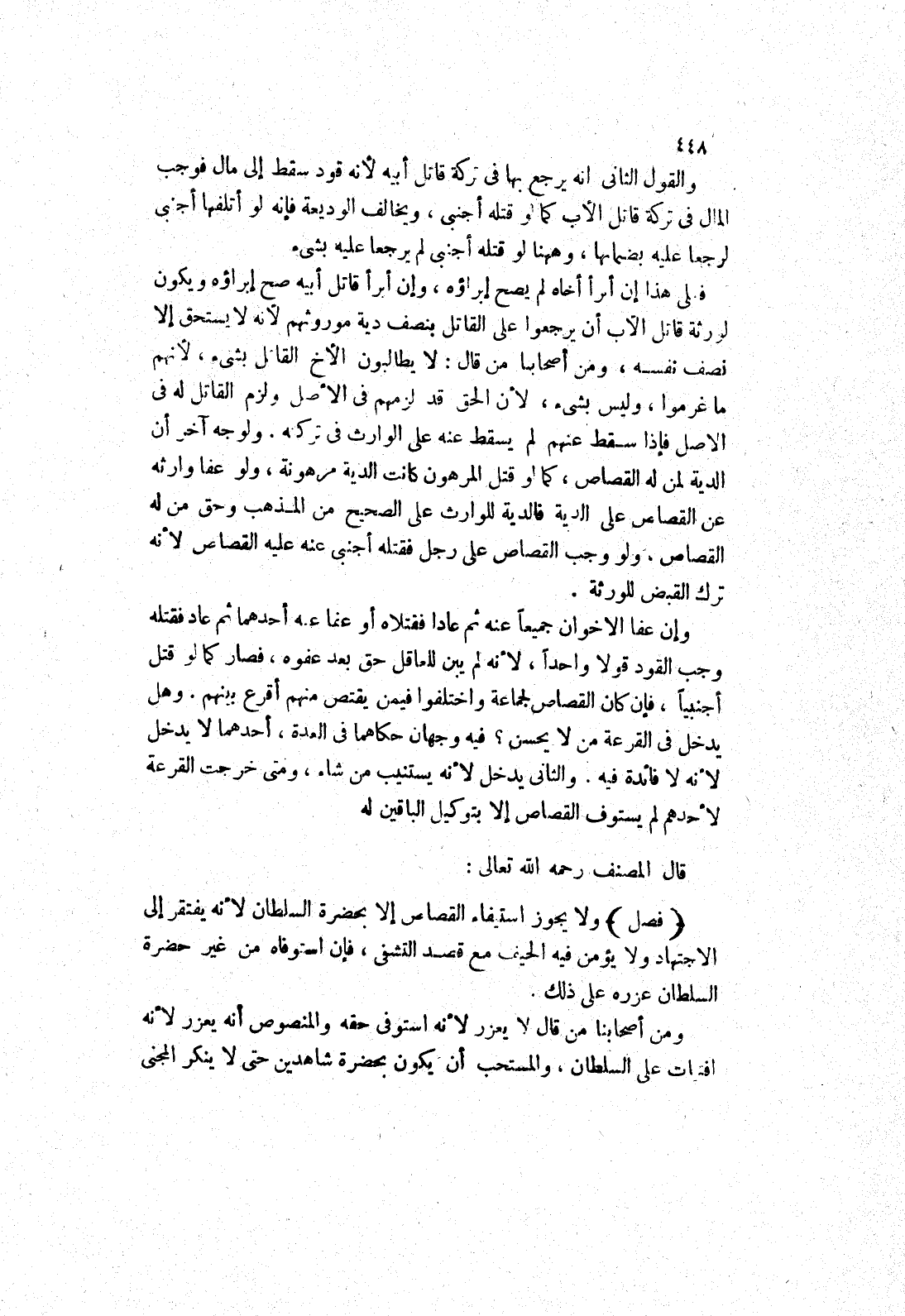 ولايجوز استيفاء القصاص إلا بحضرة السلطان لانه يفتقر إلى الاجتهاد ولا يؤمن فيه الحيف مع قصد التشفي، فإن استوفاه من غير حضرة السلطان عزره على ذلك.