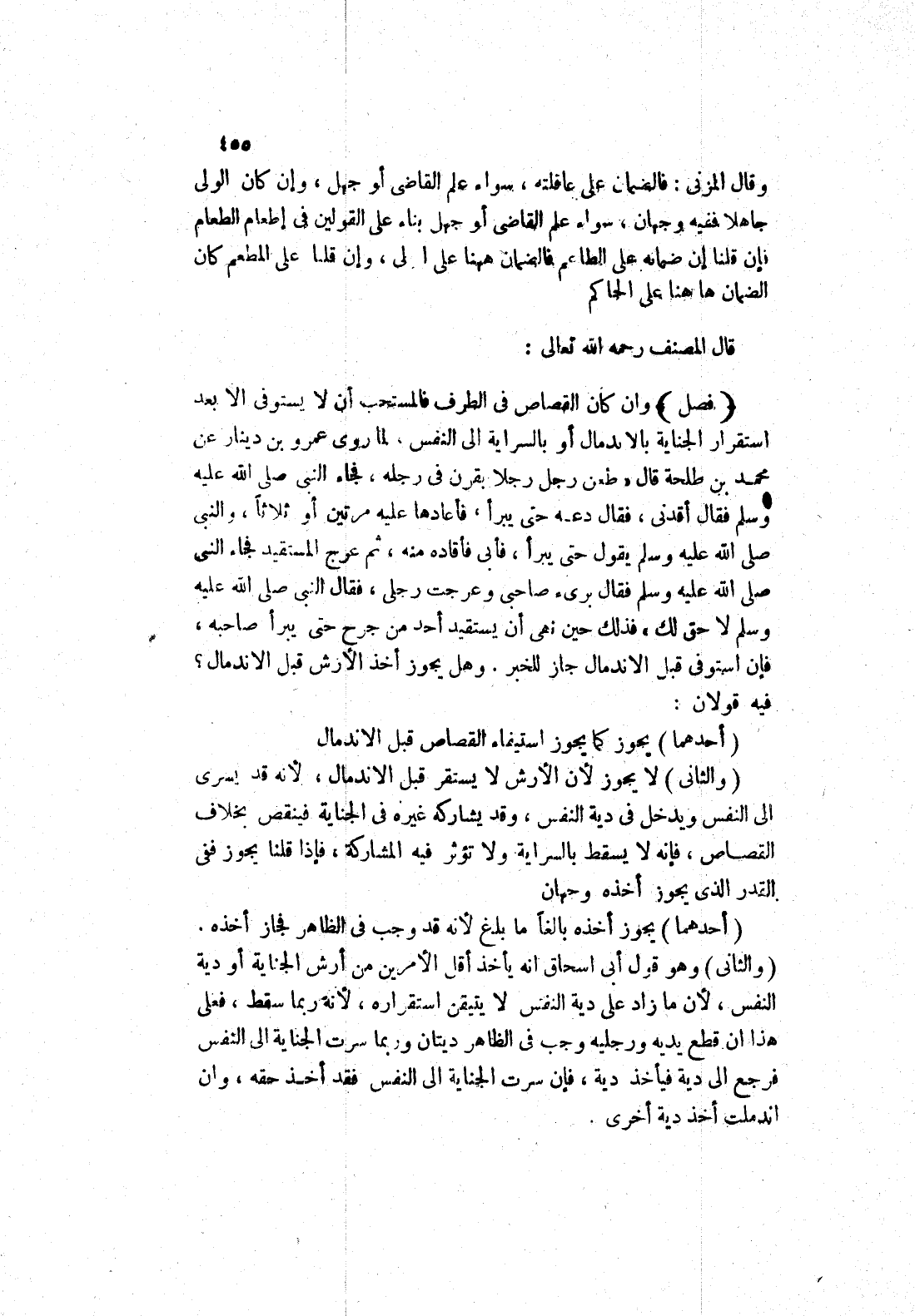 وهو قول أبى اسحاق انه يأخذ أقل الامرين من أرش الجناية أو دية النفس، لان ما زاد على دية النفس لا يتيقن استقراره، لانه ربما سقط، فعلى هذا ان قطع يديه ورجليه وجب في الظاهريتان وربما سرت الجناية إلى النفس فرجع إلى دية فيأخذ دية، فإن سرت الجناية إلى النفس فقد أخذ حقه، وان اندملت أخذ دية أخرى.