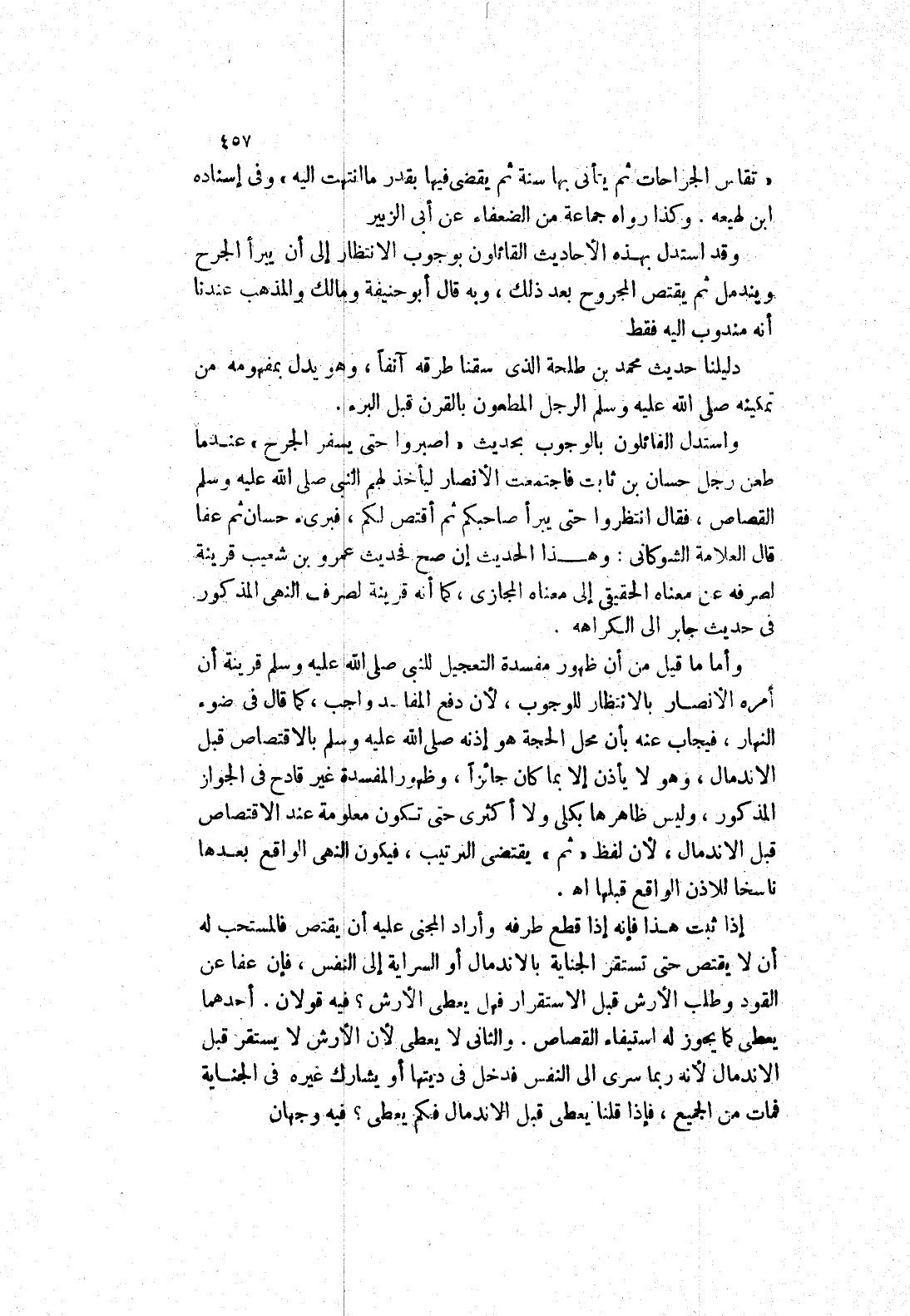 وأما ما قيل من أن ظهور مفسدة التعجيل للنبي صلى الله عليه وسلم قرينة أن أمره الانصار بالانتظار للوجوب، لان دفع المفاسد واجب، كما قال في ضوء النهار، فيجاب عنه بأن محل الحجة هو إذنه صلى الله عليه وسلم بالاقتصاص قبل الاندمال، وهو لا يأذن إلا بما كان جائزا، وظهور المفسدة غير قادح في الجواز المذكور، وليس ظاهرها بكلى ولا أكثرى حتى تكون معلومة عند الاقتصاص قبل الاندمال، لان لفظ " ثم " يقتضى الترتيب، فيكون النهى الواقع بعدها ناسخا للاذن الواقع قبلها اه.