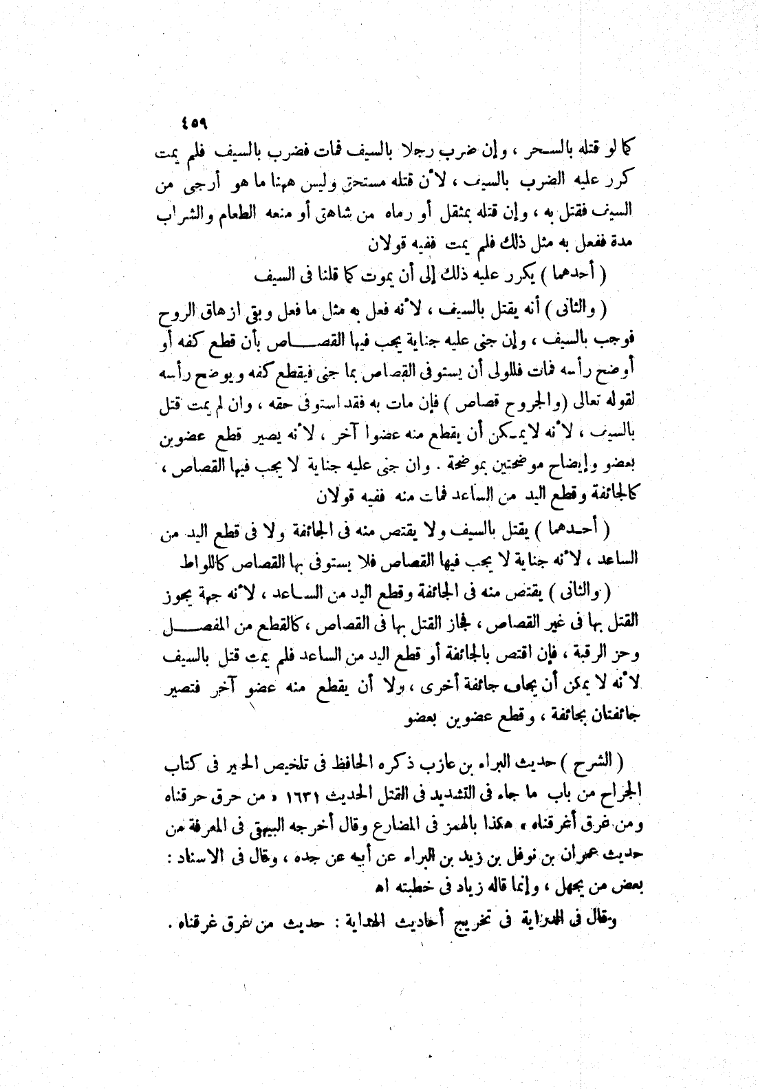 يقتص منه في الجائفة وقطع اليد من الساعد، لانه جهة يجوز القتل بها في غير القصاص، فجاز القتل بها في القصاص، كالقطع من المفصل وحز الرقبة، فإن اقتص بالجائفة أو قطع اليد من الساعد فلم يمت قتل بالسيف لانه لا يمكن أن يجاف بجائفة أخرى، ولا أن يقطع منه عضو آخر فتصير جائفتان بجائفة، وقطع عضوين بعضو (الشرح) حديث البراء بن عازب ذكره الحافظ في تلخيص الحير في كتاب الجراح من باب ما جاء في التشديد في القتل الحديث 1631 " من حرق حرقناه ومن غرق أغرقناه " هكذا بالهمز في المضارع وقال أخرجه البيهقى في المعرفة من حديث عمران بن نوفل بن زيد بن البراء عن أبيه عن جده، وقال في الاسناد: بعض من يجهل، وإنما قاله زياد في خطبته أه وقال في الدراية في تخريج أحاديث الهداية: حديث من غرق غرقناه.