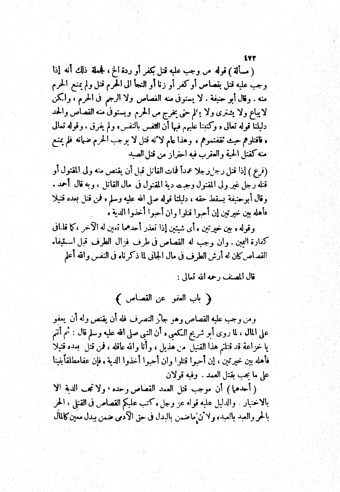 ومن وجب عليه القصاص وهو جائز التصرف فله أن يقتص وله أن يعفو على المال، لما روى أبو شريح الكعبي " إنَّ النَّبِيَّ صَلَّى اللَّهُ عَلَيْهِ وَسَلَّمَ قَالَ: ثم أنتم يا خزاعة قد قتلم هذا القتيل من هذيل، وأنا والله عاقله، فمن قتل بعده قتيلا فأهله بين خيرتين، ان أحبوا قتلوا وان أحبوا أخذوا الدية " فإن عفا مطلقا بنينا على ما يجب بقتل العمد.