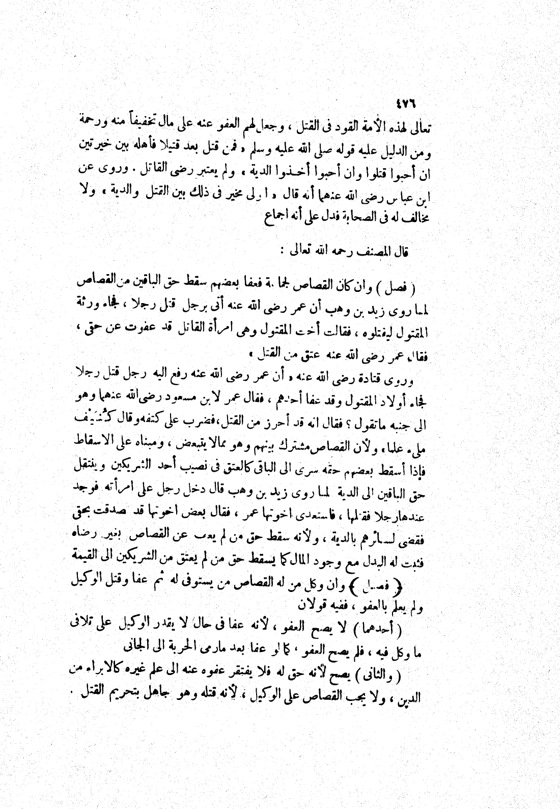 وان كان القصاص لجماعة فعفا بعضهم سقط حق الباقين من القصاص لما روى زيد بن وهب أن عمر رضى الله عنه أتى برجل قتل رجلا، فجاء ورثة المقتول ليقتلوه، فقالت أخت المقتول وهى امرأة القاتل قد عفوت عن حقى، فقال عمر رضى الله عنه عتق من القتل) وروى قتادة رضى الله عنه (أن عمر رضى الله عنه رفع إليه رجل قتل رجلا فجاء أولاد المقتول وقد عفا أحدهم، فقال عمر لابن مسعود رضى الله عنهما وهو إلى جنبه ما تقول؟ فقال انه قد أحرز من القتل، فضرب على كتفه وقال كنيف ملئ علما) ولان القصاص مشترك بينهم وهو مما لا يتبعض، ومبناه على الاسقاط فإذا أسقط بعضهم حقه سرى إلى الباقي كالعتق في نصيب أحد الشريكين وينتقل حق الباقين إلى الدية لما روى زيد بن وهب قال دخل رجل على امرأته فوجد عندها رجلا فقتلها، فاستعدى اخوتها عمر، فقال بعض اخوتها قد صدقت بحقى فقضى لسائرهم بالدية، ولانه سقط حق من لم يعف عن القصاص بغير رضاه فثبت له البدل مع وجود المال كما يسقط حق من لم يعتق من الشريكين إلى القيمة