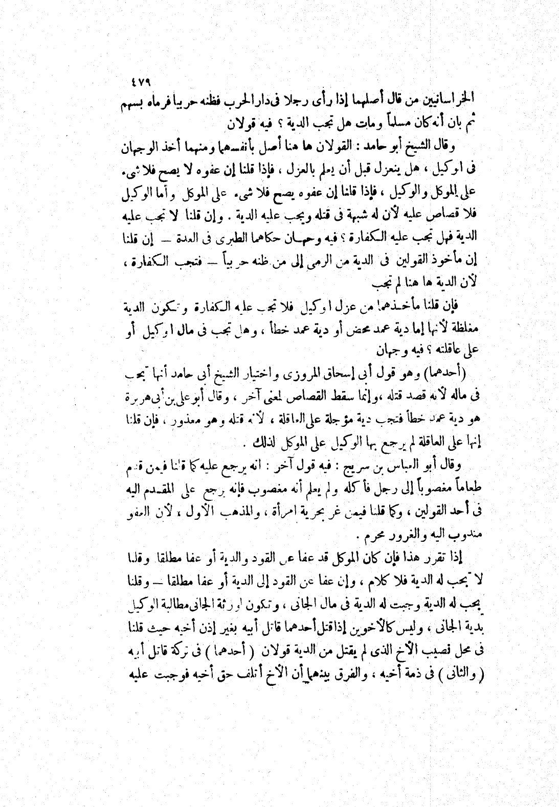 الخراسانين من قال أصلهما إذا رأى رجلا في دار الحرب فظنه حربيا فرماه بسهم ثم بان أنه كان مسلما ومات هل تجب الدية؟ فيه قولان وقال الشيخ أبو حامد: القولان ها هنا أصل بأنفسهما ومنها أخذ الوجهان في الوكيل، هل ينعزل قبل أن يعلم بالعزل، فإذا قلنا إن عفوه لا يصح فلا شئ على الموكل والوكيل، فإذا قلنا إن عفوه يصح فلا شئ على الموكل وأما الوكيل فلا قصاص عليه لان له شبهة في قتله ويجب عليه الدية.