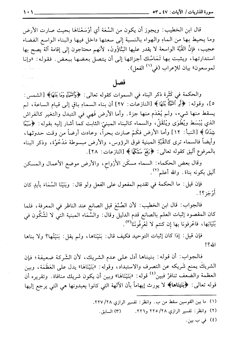 قال ابن الخطيب: ويجوز أن يكون من السَّعَة أي أوْسَعْنَاهَا بحيث صارت الأرض وما يحيط بها من الماءِ والهواء بالنسبة إلى سعتها داخل فيها والبناء الواسع الفضاء عجيب، فإِنَّ القُبَّة الواسعة لا يقدر عليها البَنَّاؤُونَ، لأنهم محتاجون إِلى إقامة آلة يصح بها استدارتها، ويثبت بها تَمَاسُك أجزائها إلى أن يتصل بعضها ببعض. فقوله: «وإنا لموسعون» بيان للإعراب (في الفعل) .