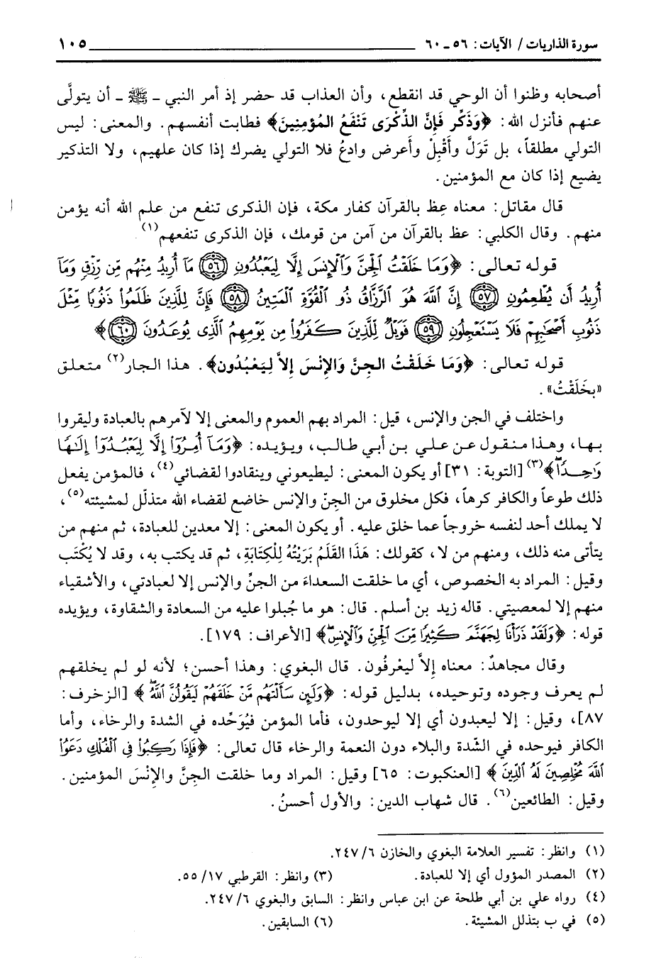 وقال مجاهدٌ: معناه إِلاَّ ليعْرفُون. قال البغوي: وهذا أحسن؛ لأنه لو لم يخلقهم لم يعرف وجوده وتوحيده، بدليل قوله: {وَلَئِن سَأَلْتَهُم مَّنْ خَلَقَهُمْ لَيَقُولُنَّ الله} [الزخرف: 87] ، وقيل: إلا ليعبدون أي إلا ليوحدون، فأما المؤمن فيُوَحِّده في الشدة والرخاء، وأما الكافر فيوحده في الشّدة والبلاء دون النعمة والرخاء قال تعالى: {فَإِذَا رَكِبُواْ فِي الفلك دَعَوُاْ الله مُخْلِصِينَ لَهُ الدين} [العنكبوت: 65] وقيل: المراد وما خلقت الجِنَّ والإِنْسَ المؤمنين. وقيل: الطائعين. قال شهاب الدين: والأول أحسنُ.