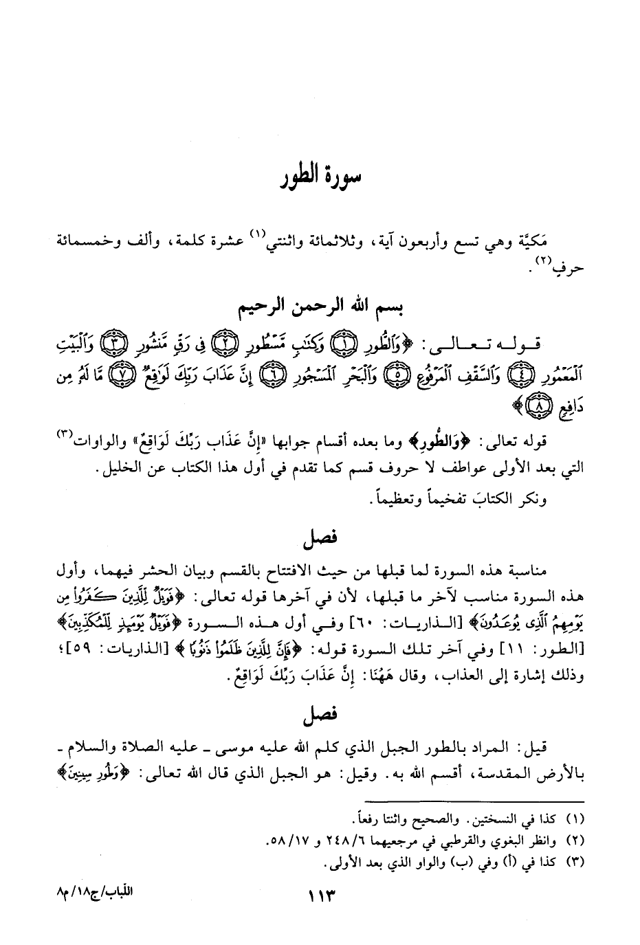 مكية وهي تسع وأربعون آية، وثلاثمائة واثنتي عشرة كلمة، وألف وخمسمائة حرف. بسم الله الرحمن الرحيم قوله تعالى: {والطور} وما بعده أقسام جوابها {إِنَّ عَذَابَ رَبِّكَ لَوَاقِعٌ} والواوات التي بعد الأولى عواطف لا حروف قسم كما تقدم في أول هذا الكتاب عن الخليل.
