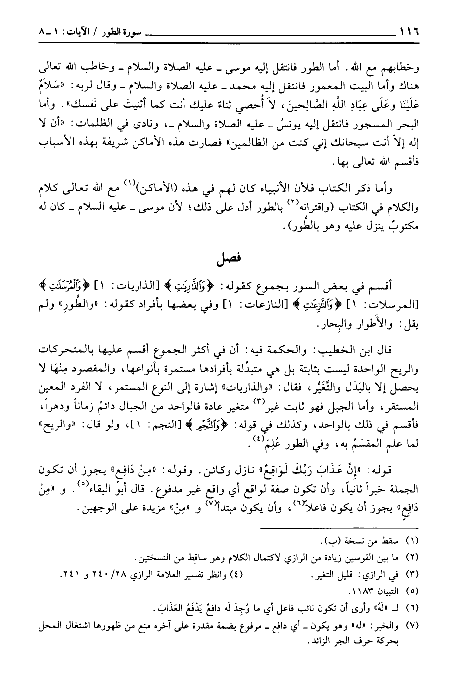 وخطابهم مع الله. أما الطور فانتقل إليه موسى - عَلَيْهِ الصَّلَاة وَالسَّلَام ُ - وخاطب الله تعالى هناك وأما البيت المعمور فانتقل إليه محمد - عَلَيْهِ الصَّلَاة وَالسَّلَام ُ - وقال لربه: «سَلاَمٌ عَلَيْنَا وعَلَى عِبَادِ اللَّهِ الصَّالِحينَ، لاَ أُحصي ثناءَ عليك أنت كما أثنيتَ على نَفسك» . وأما البحر المسجور فانتقل إليه يونسُ - عَلَيْهِ الصَّلَاة وَالسَّلَام ُ -، ونادى في الظلمات: {أن لا إله إلا أنت سبحانك إني كنت من الظالمين} فصارت هذه الأماكن شريفة بهذه الأسباب فأقسم الله تعالى بها.