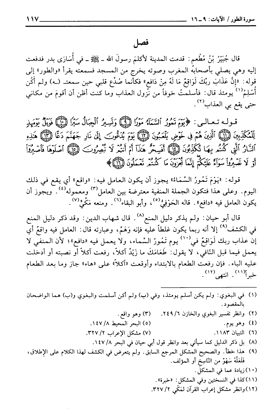 قال أبو حيان: ولم يذكر دليل المنع. قال شهاب الدين: وقد ذكر دليل المنع في الكشف إلا أنه ربما يكون غلطاً عليه فإنه وَهَمٌ، وعبارته قال: العامل فيه واقعٌ أي إن عذاب ربك لَوَاقِعٌ في يوم تَمُورُ السَّماء، ولا يعمل فيه «دافع» ؛ لأن المنفي لا يعمل فيما قبل النّافي، لا يقول: طَعَامَكَ ما زَيْدٌ آكلاً، رفعت آكلاً أو نصبته أو أدخلت عليه الباء. فإن رفعت الطعام بالابتداء وأوقعت «آكلاً» على «هاء» جاز وما بعد الطعام خبراً. انتهى.