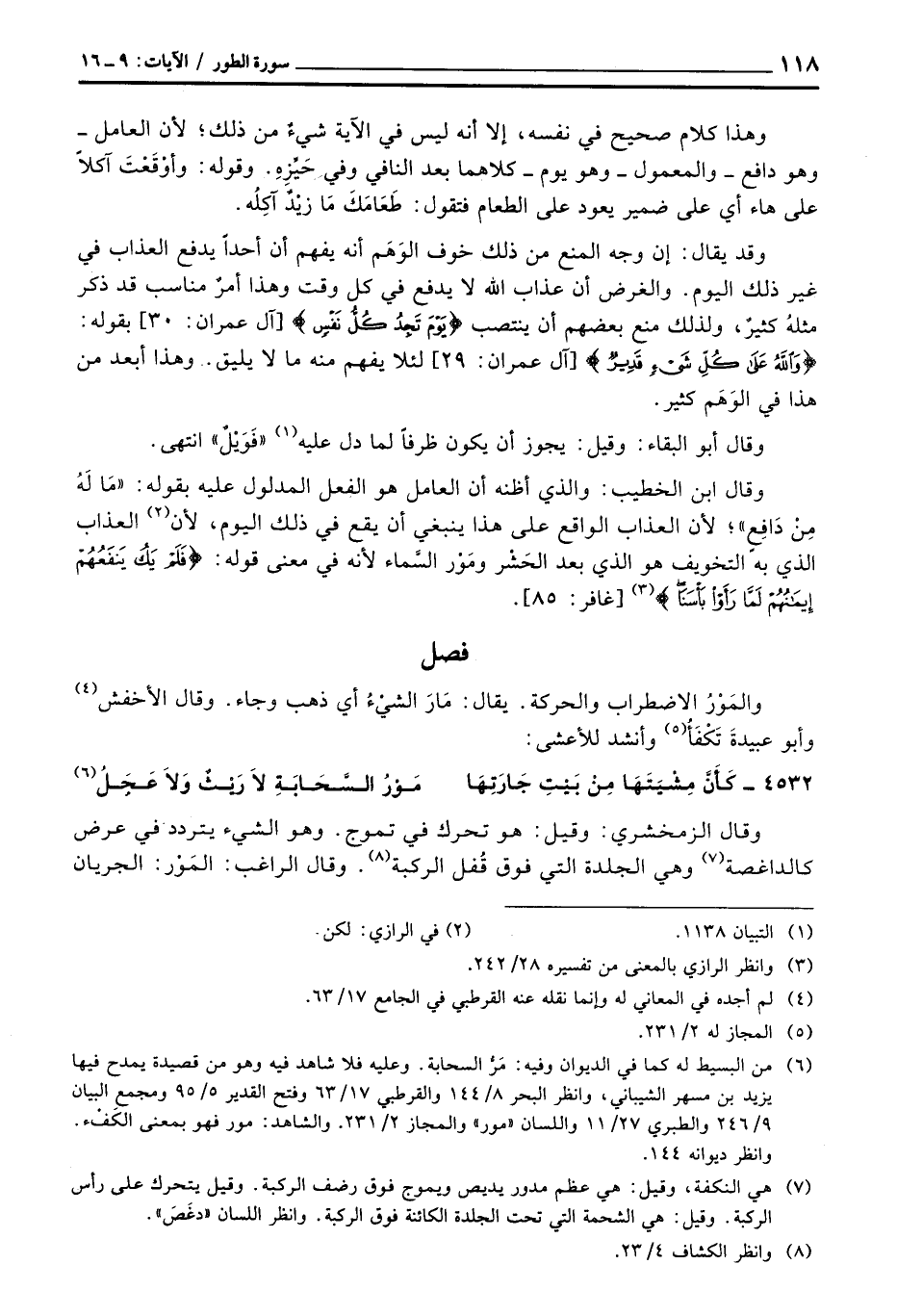 وقال ابن الخطيب: والذي أظنه أن العامل هو الفعل المدلول عليه بقوله: {مَّا لَهُ مِن دَافِعٍ} [الطور: 8] ؛ لأن العذاب الواقع على هذا ينبغي أن يقع في ذلك اليوم، لأن العذاب الذي به التخويف هو الذي بعد الحَشْر ومَوْر السَّماء لأنه في معنى قوله: {فَلَمْ يَكُ يَنفَعُهُمْ إِيمَانُهُمْ لَمَّا رَأَوْاْ بَأْسَنَا} [غافر: 85] .