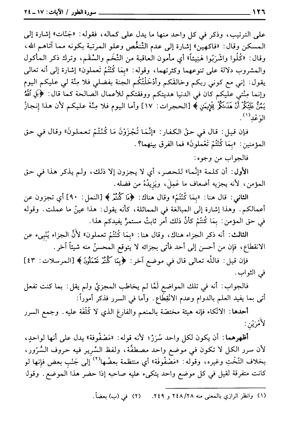 الثاني: قال هنا: «بِمَا كُنْتُمْ» وقال هناك: {مَا كُنتُمْ} [النمل: 90] أي تجزون عن أعمالكم. وهذا إشارة إلى المبالغة في المماثلة، كأنه يقول: هذا عينُ ما عملت. وقوله في حق المؤمن: بِمَا كُنْتُم كأنَّ ذلك أمر ثابتٌ مستمرٌّ يفيدكم هذا.