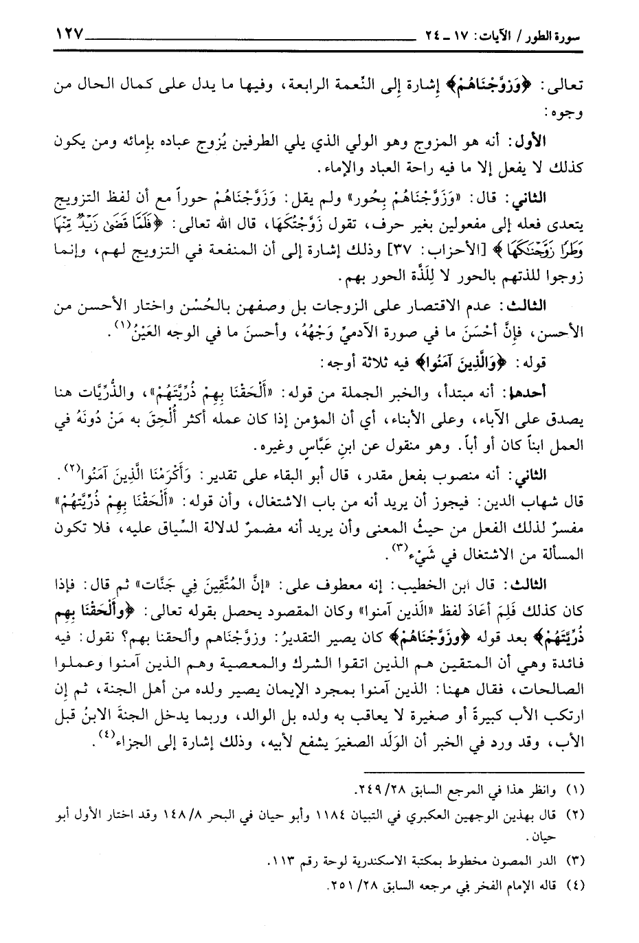 الثالث: قال ابن الخطيب: إنه معطوف على: {إِنَّ المتقين فِي جَنَّاتٍ} ثم قال: فإذا كان كذلك فَلِمَ أعَادَ لفظ «الَذين آمنوا» وكان المقصود يحصل بقوله تعالى: {أَلْحَقْنَا بِهِمْ ذُرِّيَّتَهُمْ} بعد قوله {وَزَوَّجْنَاهُم} كان يصير التقديرُ: وزوَّجْنَاهم وألحقنا بهم؟ نقول: فيه فائدة وهي أن المتقين هم الذين اتقوا الشرك والمعصية وهم الذين آمنوا وعملوا الصالحات، فقال ههنا: الذين آمنوا بمجرد الإيمان يصير ولده من أهل الجنة، ثم إِن ارتكب الأب كبيرةً أو صغيرة لا يعاقب به ولده بل الوالد، وربما يدخل الجنةَ الابنُ قبل الأب، وقد ورد في الخبر أن الوَلَد الصغيرَ يشفع لأبيه، وذلك إشارة إلى الجزاء.