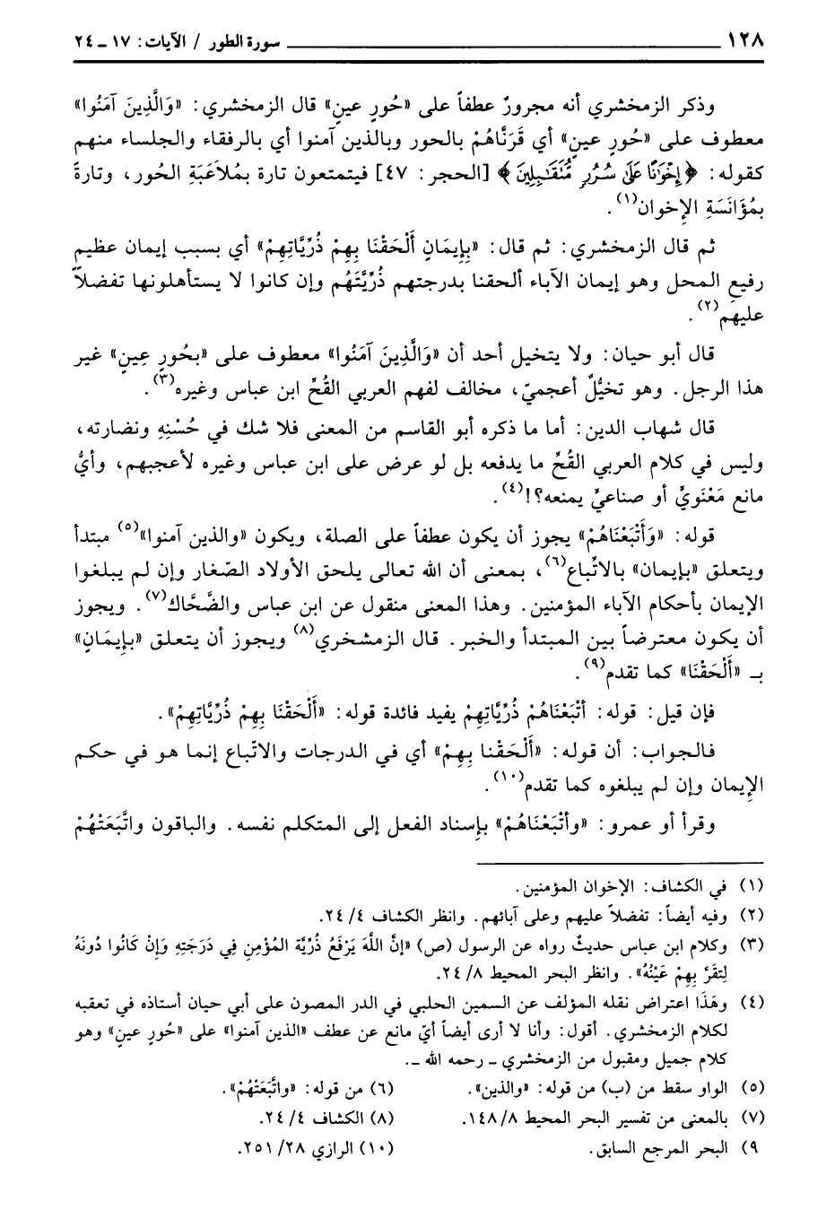 قال أبو حيان: ولا يتخيل أحد أن «وَالَّذِينَ آمَنُوا» معطوف على «بحُورٍ عِينٍ» غير هذا الرجل. وهو تخيُّلٌ أعجميّ، مخالف لفهم العربي القُحِّ ابن عباس وغيره.
