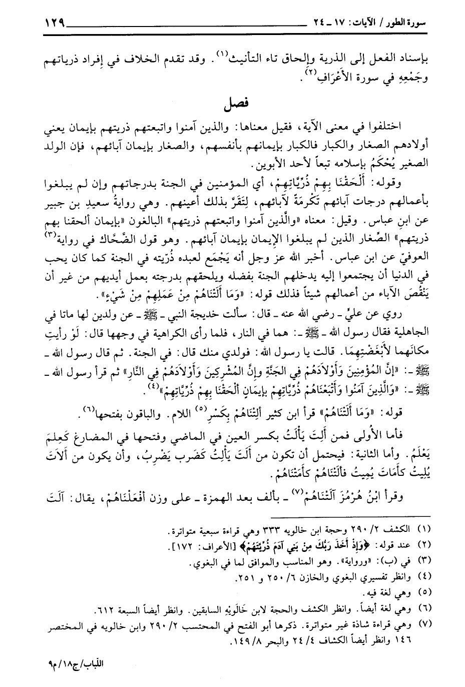 اختلفوا في معنى الآية، فقيل معناها: والذين آمنوا واتبعتهم ذريتهم بإيمان يعني أولادهم الصغار والكبار فالكبار بإيمانهم بأنفسهم، والصغار بإيمان آبائهم، فإن الولد الصغير يُحْكَمُ بإسلامه تبعاً لأحد الأبوين.
