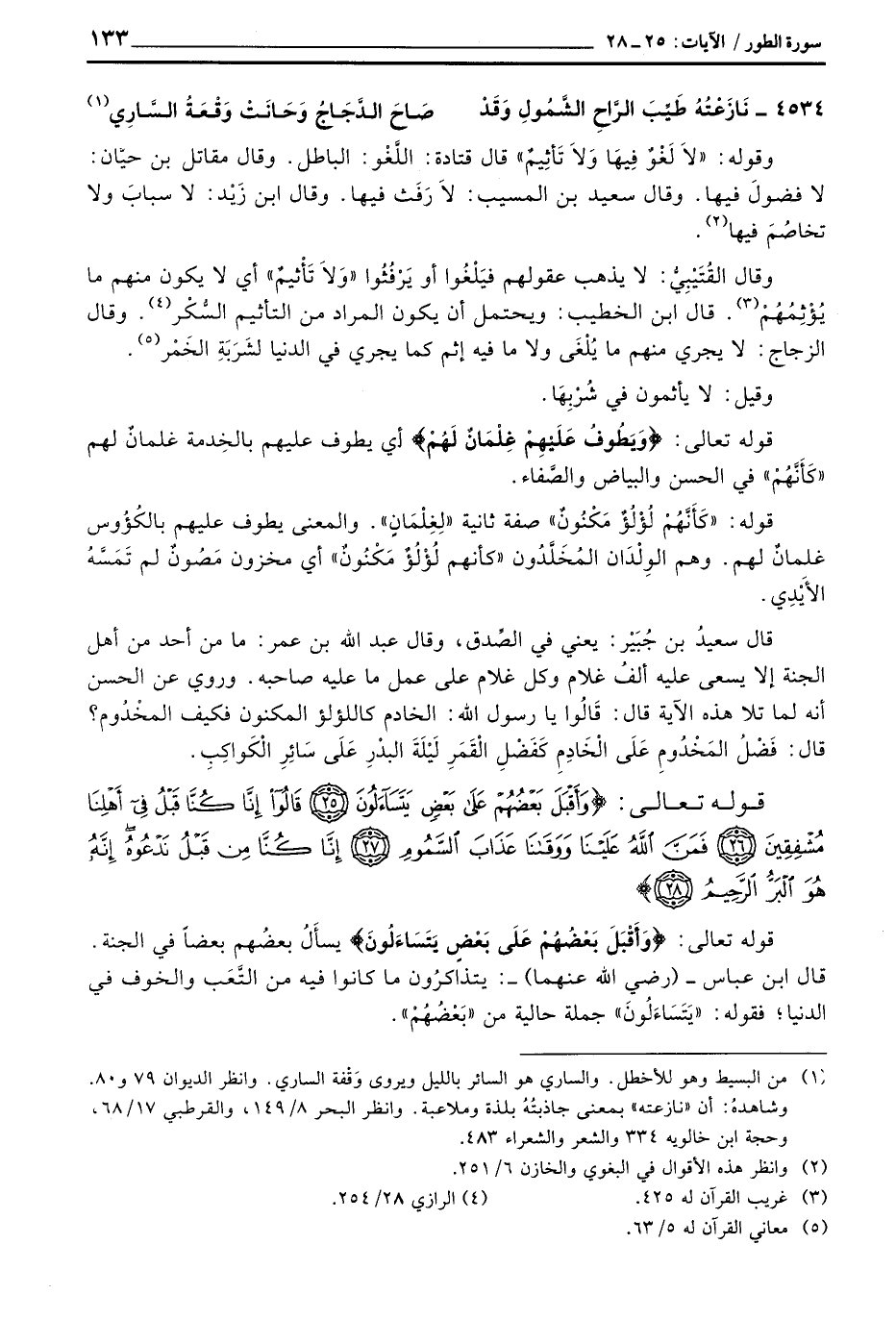 قال سعيدُ بن جُبَيْر: يعني في الصِّدق، وقال عبد الله بن عمر: ما من أحد من أهل الجنة إلا يسعى عليه ألفُ غلام وكل غلام على عمل ما عليه صاحبه. «وروي عن الحسن أنه لما تلا هذه الآية قال: قَالُوا يا رسول الله: الخادم كاللؤلؤ المكنون فكيف المخْدُوم؟ قال: فَضْلُ المَخْدُومِ عَلَى الْخَادِمِ كَفَضْلِ لَيْلَةَ البدْرِ عَلَى سَائِرِ الْكَواكِبِ» .