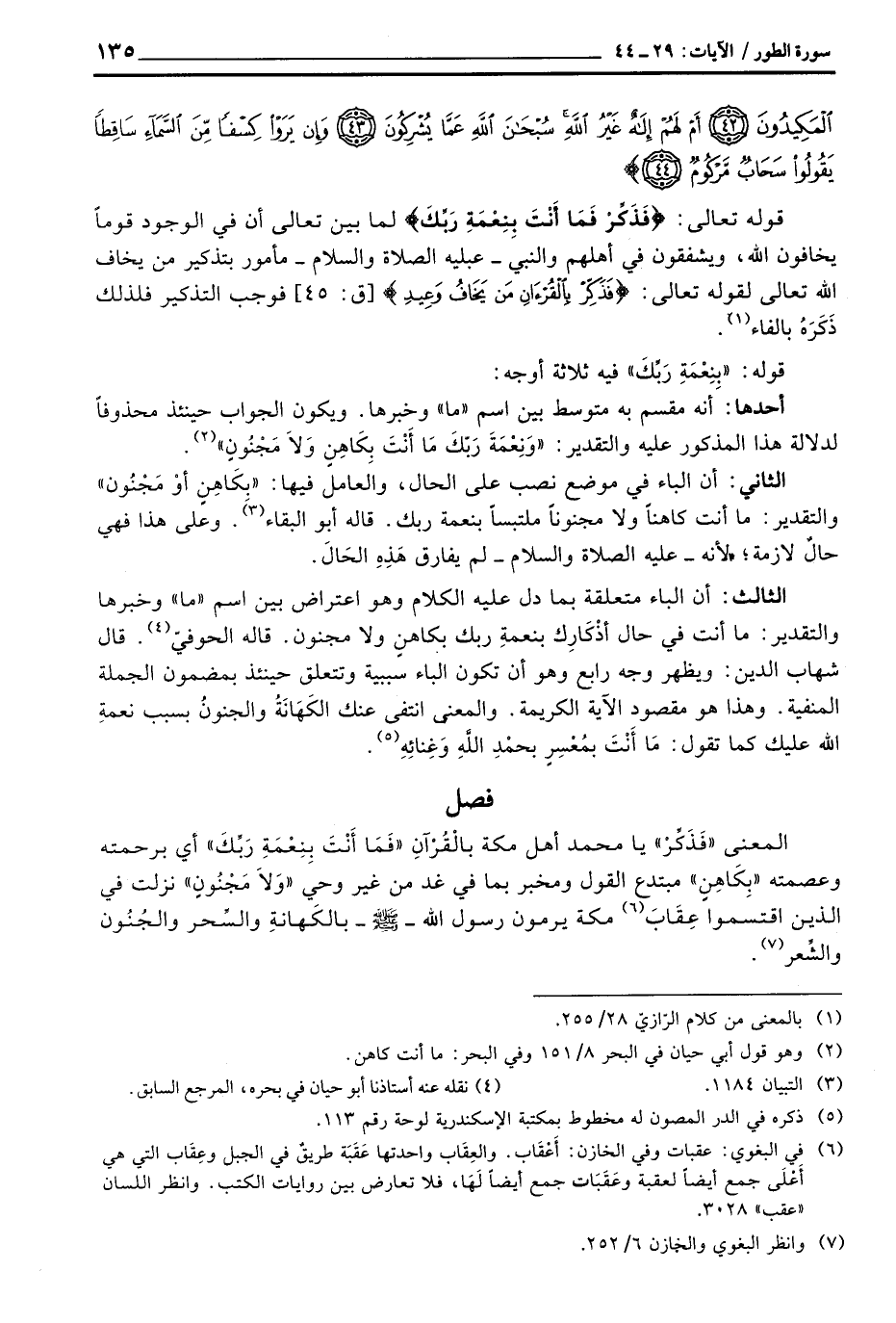 المعنى «فَذَكِّرْ» يا محمد أهل مكة بالْقُرْآنِ {فَمَآ أَنتَ بِنِعْمَةِ رَبِّكَ} أي برحمته وعصمته «بِكَاهِنٍ» مبتدع القول ومخبر بما في غد من غير وحي «وَلاَ مَجْنُونٍ» نزلت في الذين اقتسموا عِقَابَ مكة يرمون رسول الله - صَلَّى اللَّهُ عَلَيْهِ وَسَلَّم َ - بالكَهانةِ والسِّحر والجُنُون والشِّعر.