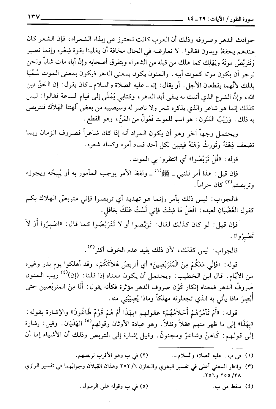 حوادث الدهر وصروفه وذلك أن العرب كانت تحترز عن إيذاء الشعراء، فإن الشعر كان عندهم يحفظ ويدون فقالوا: لا نعارضه في الحال مخافة أن يغلبنا بقوة شِعْره وإنما نصبر وَنَتَربَّصُ موتَهُ ويَهْلِك كما هلك من قبله من الشعراء ويتفرق أصحابه وإنّ أباه مات شاباً ونحن نرجو أن يكون موته كموت أبيه. والمنون يكون بمعنى الدهر فيكون بمعنى الموت سُمِّيَا بذلك لأنَّهما يقطعان الأجل. أو يقال: إنه - عَلَيْهِ الصَّلَاة وَالسَّلَام ُ - كان يقول: إن الحَقَّ دين الله، وإنَّ الشرع الذي أتيت به يبقى أبد الدهر، وكتابي يُمْلَى إلى قيام الساعة فقالوا: ليس كذلك إنما هو شاعر والذي يذكره شعر ولا ناصر له وسيصيبه من بعض آلهتنا الهَلاَك فنتربص به ذلك. وَرَيْبُ المَنُون: هو اسم للموت فَعُولٌ من المَنِّ، وهو القطع.