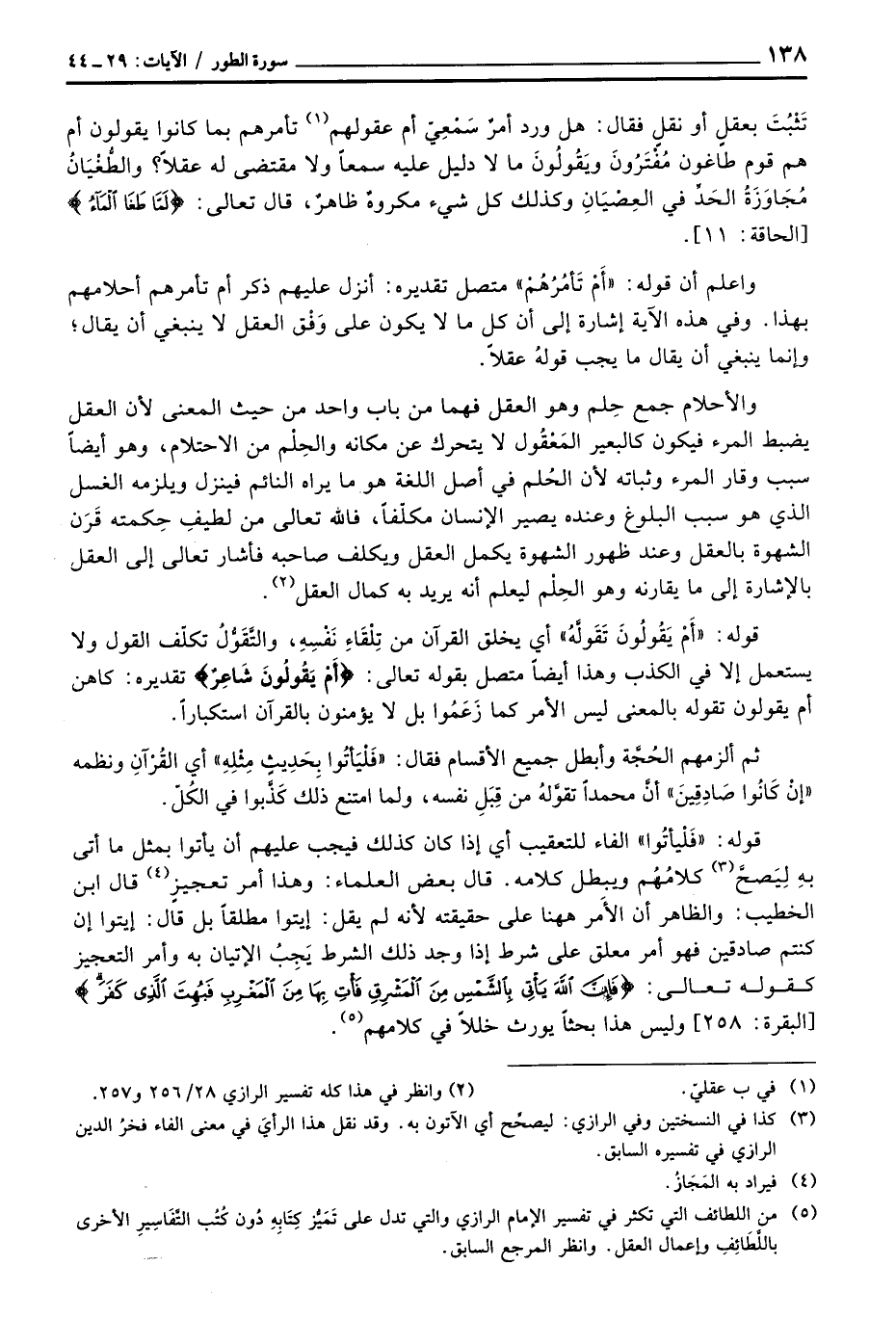 تَثْبُتَ بعقلٍ أو نقلٍ فقال: هل ورد أمرٌ سَمْعِيّ أم عقولهم تأمرهم بما كانوا يقولون أم هم قوم طاغون مُفْتَرُونَ ويَقُولُونَ ما لا دليل عليه سمعاً ولا مقتضى له عقلاً؟ والطُّغْيَان مُجَاوَزَةُ الحَدِّ في العِصْيَانِ وكذلك كل شيء مكروهٌ ظاهرٌ، قال تعالى: