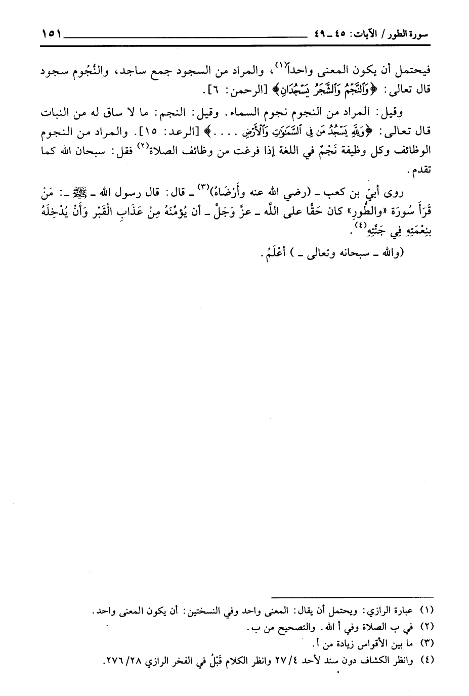وقيل: المراد من النجوم نجوم السماء. وقيل: النجم: ما لا ساق له من النبات قال تعالى: {وَللَّهِ يَسْجُدُ مَن فِي السماوات والأرض ... .} [الرعد: 15] . والمراد من النجوم الوظائف وكل وظيفة نَجْمٌ في اللغة إذا فرغت من وظائف الصلاة فقل: سبحان الله كما تقدم.