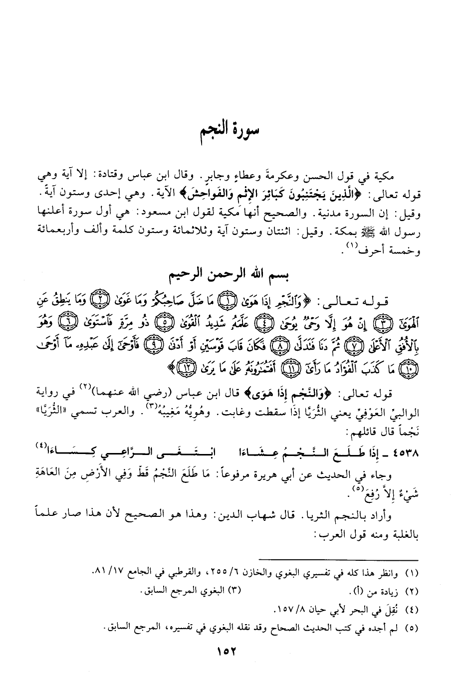 مكية في قول الحسن وعكرمة وعطاء وجابر. وقال ابن عباس وقتادة: إلا آية وهي قوله تعالى: {الذين يجتنبون كبائر الإثم والفواحش} الآية. وهي إحدى وستون آية. وقيل: إن السورة مدنية. والصحيح أنها مكية لقول ابن مسعود: هي أول سورة أعلنها رسول الله صَلَّى اللهُ عَلَيْهِ وَسَلَّمَ بمكة. وقيل: اثنتان وستون آية وثلاثمائة وستون كلمة وألف وأربعمائة وخمسة أحرف. بسم الله الرحمن الرحيم قوله تعالى: {والنجم إِذَا هوى} قال ابن عباس (رَضِيَ اللَّهُ عَنْهما) في رواية الوالبيِّ العَوْفِيِّ يعني الثُّرَيَّا إذَا سقطت وغابت. وهُوِيُّهُ مَغِيبُهُ. والعرب تسمي «الثُّرَيَّا» نَجْماً قال قائلهم: