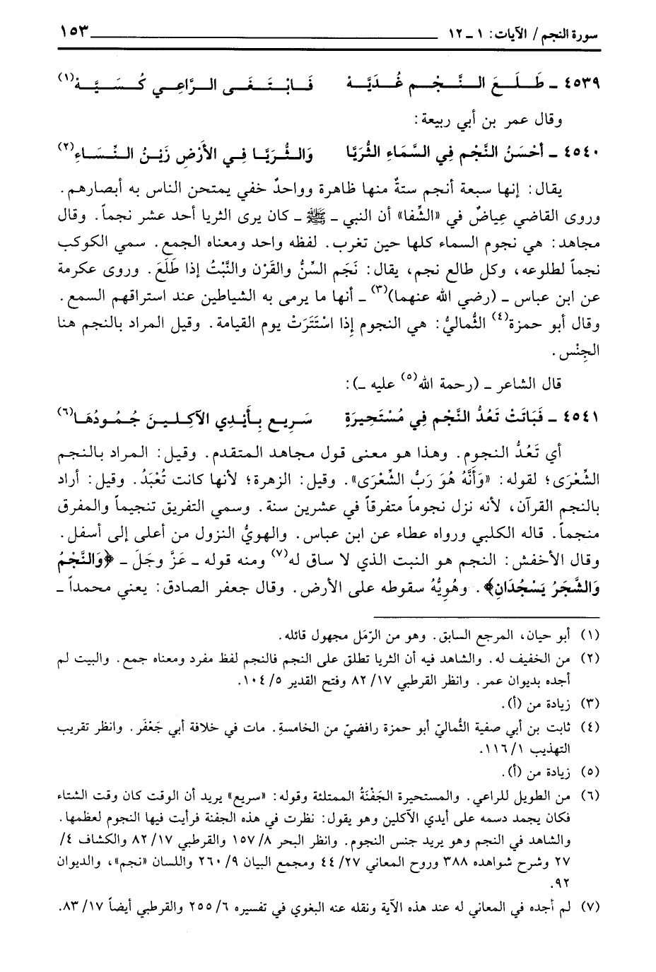 يقال: إنها سبعة أنجم ستةٌ منها ظاهرة وواحدٌ خفي يمتحن الناس به أبصارهم. وروى القاضي عِياضٌ في «الشِّفا» أن النبي - صَلَّى اللَّهُ عَلَيْهِ وَسَلَّم َ - كان يرى الثريا أحد عشر نجماً. وقال مجاهد: هي نجوم السماء كلها حين تغرب. لفظه واحد ومعناه الجمع. سمي الكوكب نجماً لطلوعه، وكل طالع نجم، يقال: نَجَم السِّنُّ والقَرْن والنَّبْتُ إذا طَلَعَ. وروى عكرمة عن ابن عباس - (رَضِيَ اللَّهُ عَنْهما) - أنها ما يرمى به الشياطين عند استراقهم السمع. وقال أبو حمزة الثُّماليُّ: هي النجوم إِذا اسْتَتَرَتْ يوم القيامة. وقيل المراد بالنجم هنا الجِنْس.