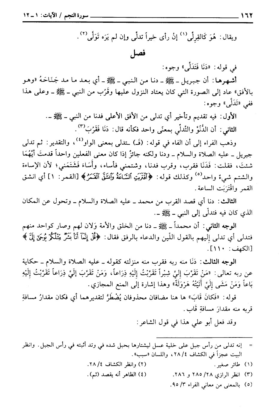 أشهرها: أن جبريل - صَلَّى اللَّهُ عَلَيْهِ وَسَلَّم َ - دنا من النبي - صَلَّى اللَّهُ عَلَيْهِ وَسَلَّم َ - أي بعد ما مد جَنَاحَهُ «وهو بالأفق» عاد إلى الصورة التي كان يعتاد النزول عليها وقَرُب من النبي - صَلَّى اللَّهُ عَلَيْهِ وَسَلَّم َ - وعلى هذا ففي «تَدَلَّى» وجوه: