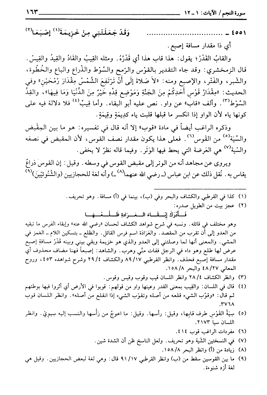 ويروى عن مجاهد أنه من الوتر إلى مقبض القوس في وسطه. وقيل: إن القوس ذراعٌ يقاس به. نُقل ذلك عن ابن عباس (- رَضِيَ اللَّهُ عَنْهما -) وأنه لغة للحجازيين (والشَّنُوئيّينَ)