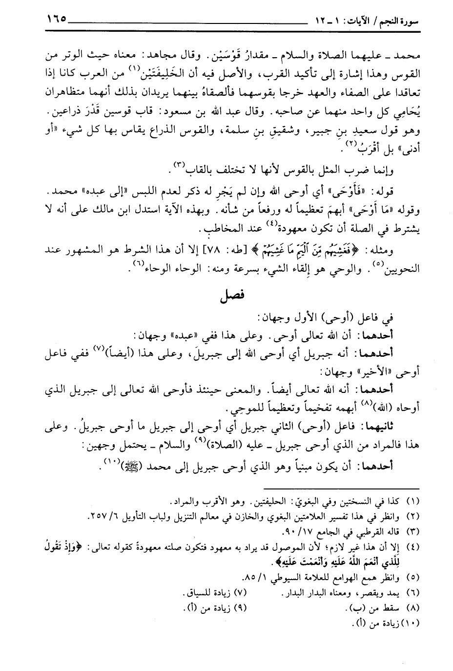 محمد - عليهما الصلاة والسلام - مقدارُ قَوْسَيْن. وقال مجاهد: معناه حيث الوتر من القوس وهذا إشارة إلى تأكيد القرب، والأصل فيه أن الخَلِيفَتَيْن من العرب كانا إذا تعاقدا على الصفاء والعهد خرجا بقوسهما فألصقاهُ بينهما يريدان بذلك أنهما متظاهران يُحَامِي كل واحد منهما عن صاحبه. وقال عبد الله بن مسعود: قاب قوسين قَدْرَ ذراعين. وهو قول سعيدِ بنِ جبير، وشقيقِ بنِ سلمة، والقوس الذراع يقاس بها كل شيء «أو أدنى» بل أقْرَبُ.