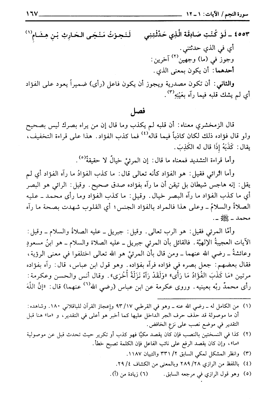 قال الزمخشري معناه: أن قلبه لم يكذب وما قال إن من يراه بصرك ليس بصحيح ولو قال فؤاده ذلك لكان كاذباٌ فيما قاله فما كذب الفؤاد. هذا على قراءة التخفيف، يقال: كَذَبَهُ إِذَا قال له الكَذِبَ.