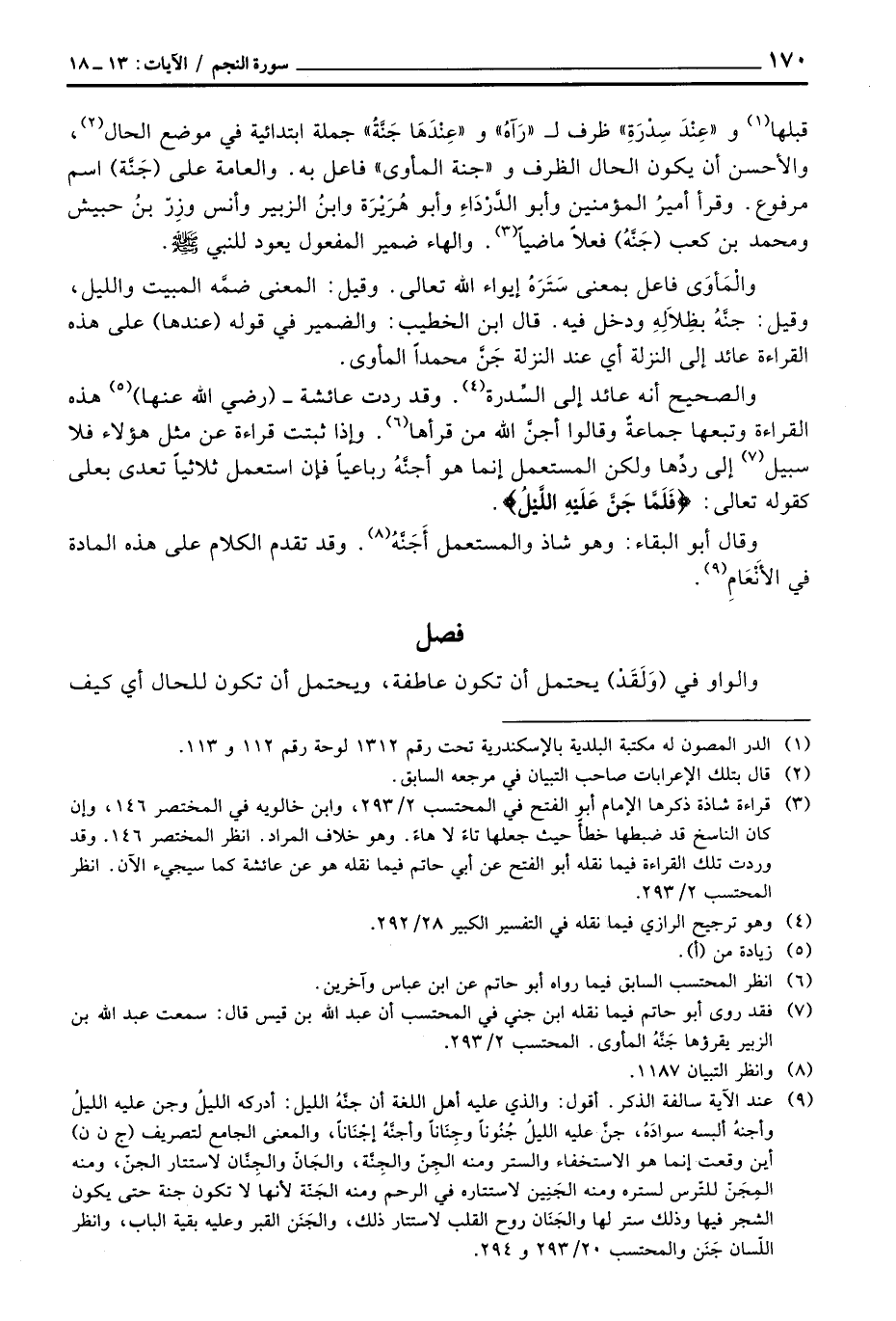 قبلها و «عِنْدَ سِدْرَةِ» ظرف ل «رَآهُ» و «عِنْدَهَا جَنَّةُ» جملة ابتدائية في موضع الحال، والأحسن أن يكون الحال الظرف و «جنة المأوى» فاعل به. والعامة على (جَنَّة) اسم مرفوع. وقرأ أميرُ المؤمنين وأبو الدَّرْدَاءِ وأبو هُرَيْرَة وابنُ الزبير وأنس وزِرّ بنُ حبيش ومحمد بن كعب (جَنَّةُ) فعلاً ماضياً. والهاء ضمير المفعول يعود للنبي صَلَّى اللَّهُ عَلَيْهِ وَسَلَّم َ.