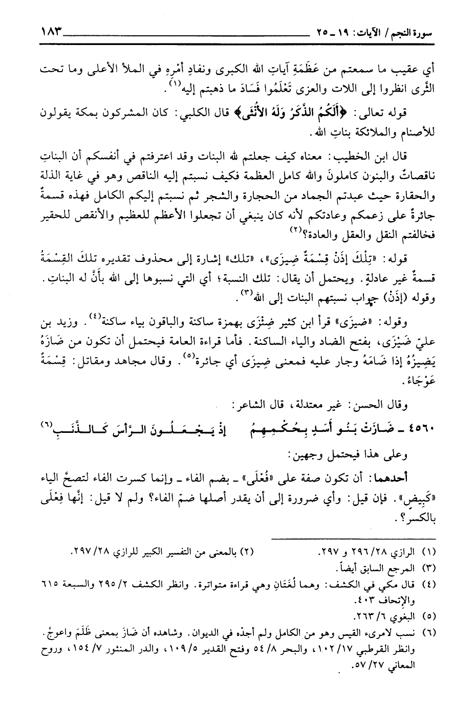 قوله: {تِلْكَ إِذاً قِسْمَةٌ ضيزى} ، «تلك» إشارة إلى محذوف تقديره تلكَ القِسْمَةُ قسمةٌ غير عادلةٍ. ويحتمل أن يقال: تلك النسبة؛ أي التي نسبوها إلى الله بأَنَّ له البناتِ. وقوله (إذَنْ) جواب نسبتهم البنات إلى الله.