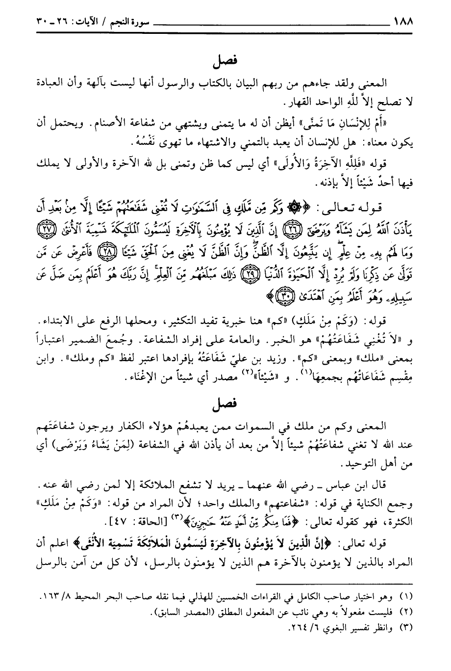 قال ابن عباس - رَضِيَ اللَّهُ عَنْهما - يريد لا تشفع الملائكة إلا لمن رَضِيَ اللَّهُ عَنْه. وجمع الكناية في قوله: «شفاعتهم» والملك واحد؛ لأن المراد من قوله: {وَكَمْ مِّن مَّلَكٍ} الكثرة، فهو كقوله تعالى: {فَمَا مِنكُمْ مِّنْ أَحَدٍ عَنْهُ حَاجِزِينَ} [الحاقة: 47] .