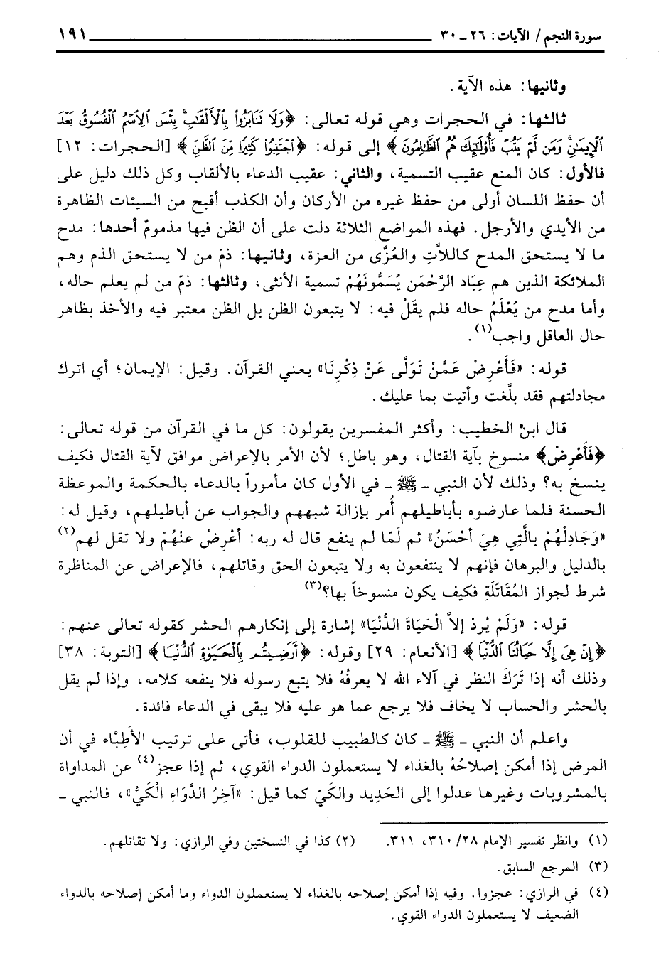 قال ابن الخطيب: وأكثر المفسرين يقولون: كل ما في القرآن من قوله تعالى: {فَأَعْرِضْ} منسوخ بآية القتال، وهو باطل؛ لأن الأمر بالإعراض موافق لآية القتال فكيف ينسخ به؟ وذلك لأن النبي - صَلَّى اللَّهُ عَلَيْهِ وَسَلَّم َ - في الأول كان مأموراً بالدعاء بالحكمة والموعظة الحسنة فلما عارضوه بأباطيلهم أُمر بإزالة شبههم والجواب عن أباطيلهم، وقيل له: {وَجَادِلْهُم بالتي هِيَ أَحْسَنُ} [النحل: 125] ثم لَمّا لم ينفع قال له ربه: أعْرِضْ عنْهُمْ ولا تقل لهم بالدليل والبرهان فإنهم لا ينتفعون به ولا يتبعون الحق وقاتلهم، فالإعراض عن المناظرة شرط لجواز المُقَاتَلَةِ فكيف يكون منسوخاً بها؟