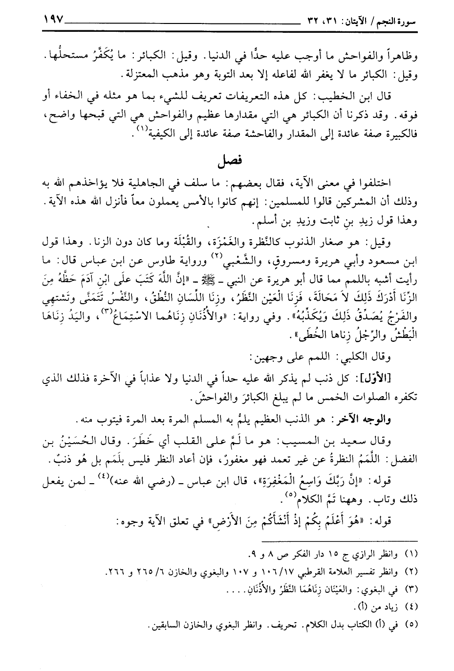 وقيل: هو صغار الذنوب كالنَّظرة والغَمْزَة، والقُبْلَة وما كان دون الزنا. وهذا قول ابن مسعود وأبي هريرة ومسروقٍ، والشَّعْبي ورواية طاوس عن ابن عباس قال: ما رأيت أشبه باللمم مما قال أبو هريرة عن النبي - صَلَّى اللَّهُ عَلَيْهِ وَسَلَّم َ - «إنَّ اللَّهَ كَتَبَ علَى ابْنِ آدَمَ حَظَّهُ مِنَ الزِّنَا أَدْرَكَ ذَلِكَ لاَ مَحَالَةَ، فَزِنَا الْعَيْن النَّظَرُ، وزِنَا اللِّسَانِ النُّطْقُ، والنَّفْسُ تَتَمَنَّى وتَشتهِي والفَرْجُ يُصَدِّقُ ذَلِكَ وَيُكَذِّبُهُ» وفي رواية: «والأُذُنَانِ زِنَاهُما الاسْتِمَاعُ، واليَدُ زِنَاهَا الْبَطْشُ والرِّجْلُ زِناها الخُطَى» .