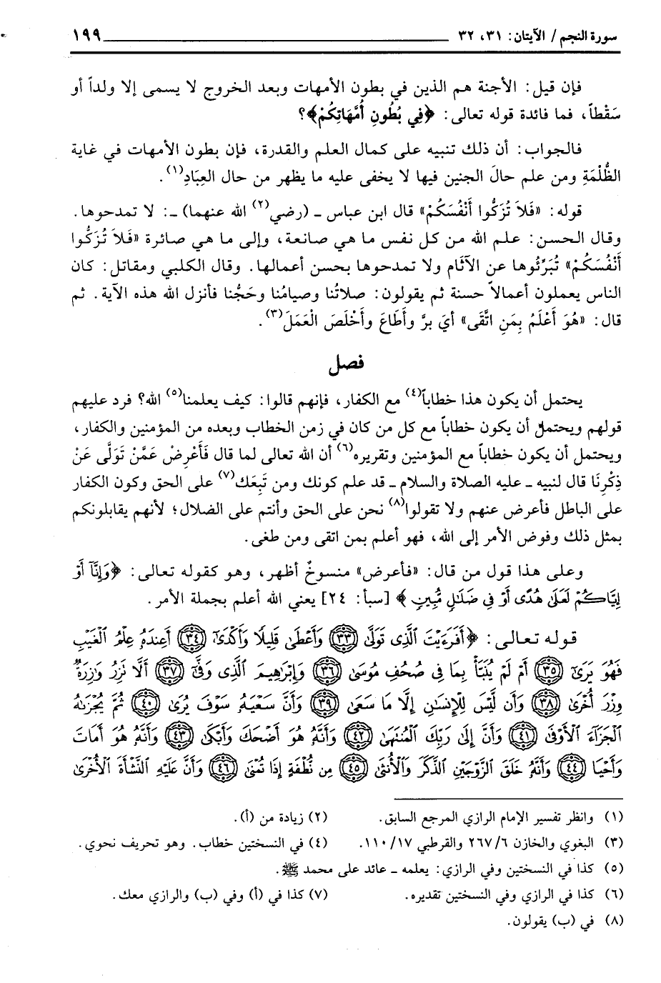 قوله: {فَلاَ تزكوا أَنفُسَكُمْ} قال ابن عباس - (رَضِيَ اللَّهُ عَنْهما) -: لا تمدحوها. وقال الحسن: علم الله من كل نفس ما هي صانعة، وإلى ما هي صائرة {فَلاَ تزكوا أَنفُسَكُمْ} تُبَرِّئُوها عن الآثَام ولا تمدحوها بحسن أعمالها. وقال الكلبي ومقاتل: كان الناس يعملون أعمالاً حسنة ثم يقولون: صلاتُنا وصيامُنا وحَجُّنا فأنزل الله هذه الآية. ثم قال: {هُوَ أَعْلَمُ بِمَنِ اتقى} أيَ برَّ وأَطَاعَ وأَخْلَصَ الْعَمَلَ.