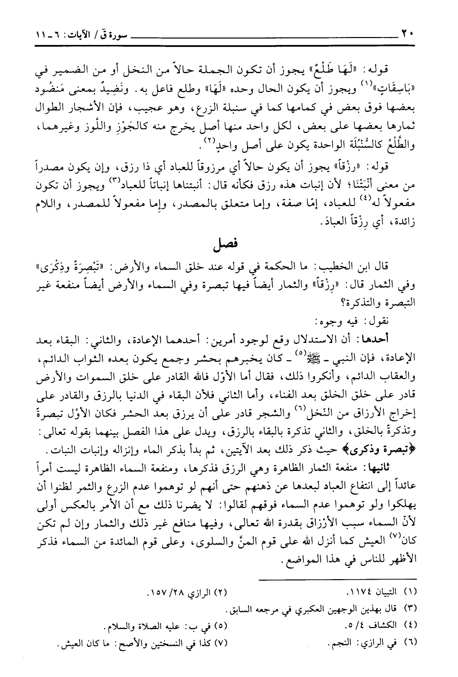 قال ابن الخطيب: ما الحكمة في قوله عند خلق السماء والأرض: «تَبْصِرَةً وذِكْرَى» وفي الثمار قال: «رِزْقاً» والثمار أيضاً فيها تبصرة وفي السماء والأرض أيضاً منفعة غير التبصرة والتذكرة؟