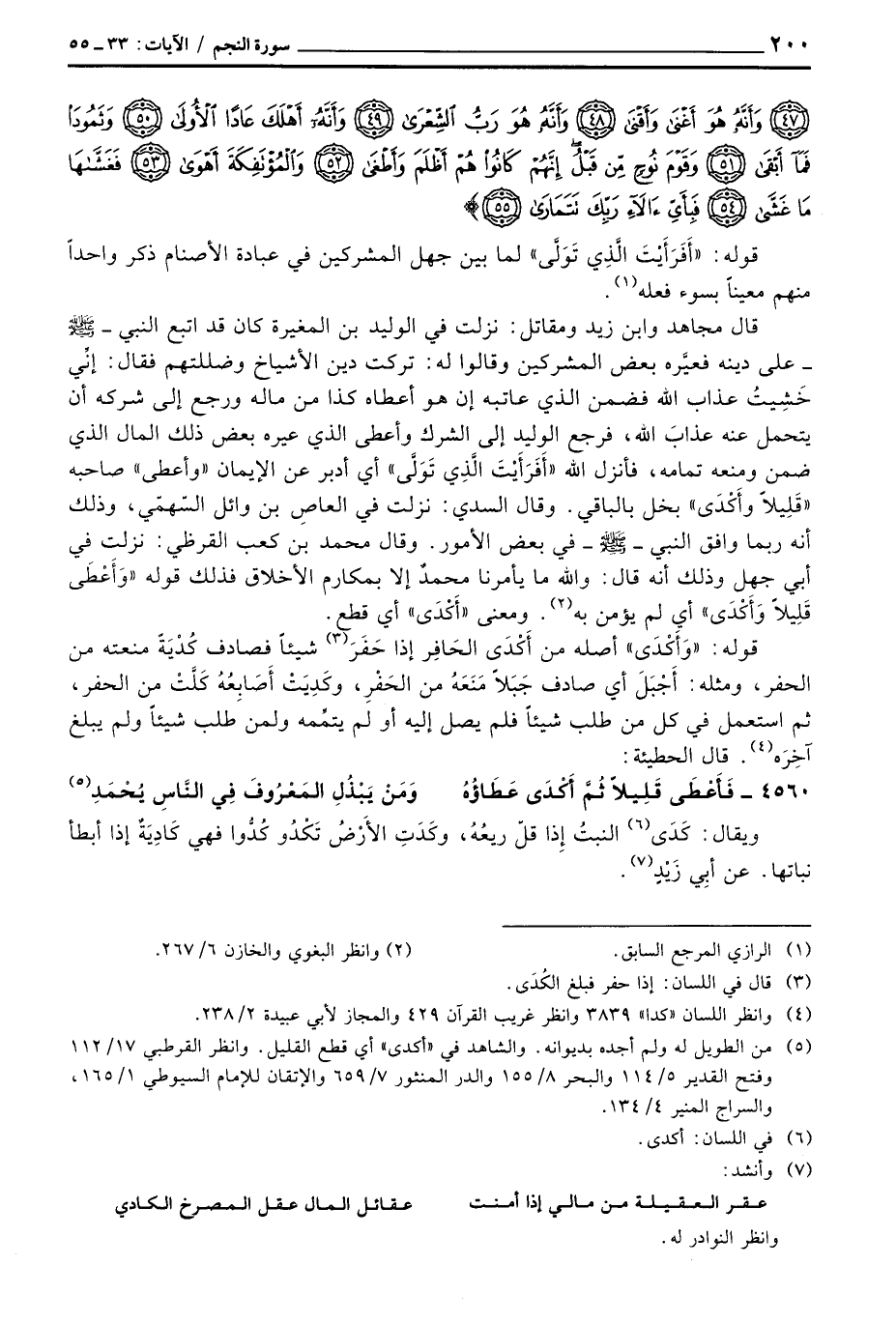 قال مجاهد وابن زيد ومقاتل: نزلت في الوليد بن المغيرة كان قد اتبع النبي - صَلَّى اللَّهُ عَلَيْهِ وَسَلَّم َ - على دينه فعيَّره بعض المشركين وقالوا له: تركت دين الأشياخ وضللتهم فقال: إنِّي خَشِيتُ عذاب الله فضمن الذي عاتبه إن هو أعطاه كذا من ماله ورجع إلى شركه أن يتحمل عنه عذابَ الله، فرجع الوليد إلى الشرك وأعطى الذي عيره بعض ذلك المال الذي ضمن ومنعه تمامه، فأنزل الله {أَفَرَأَيْتَ الذي تولى} أي أدبر عن الإيمان «وأعطى» صاحبه «قَلِيلاً وأَكْدَى» بخل بالباقي. وقال السدي: نزلت في العاصِ بن وائل السّهمّي، وذلك أنه ربما وافق النبي - صَلَّى اللَّهُ عَلَيْهِ وَسَلَّم َ - في بعض الأمور. وقال محمد بن كعب القرظي: نزلت في أبي جهل وذلك أنه قال: والله ما يأمرنا محمدٌ إلا بمكارم الأخلاق فذلك قوله {وأعطى قَلِيلاً وأكدى} أي لم يؤمن به. ومعنى «أَكْدَى» أي قطع.